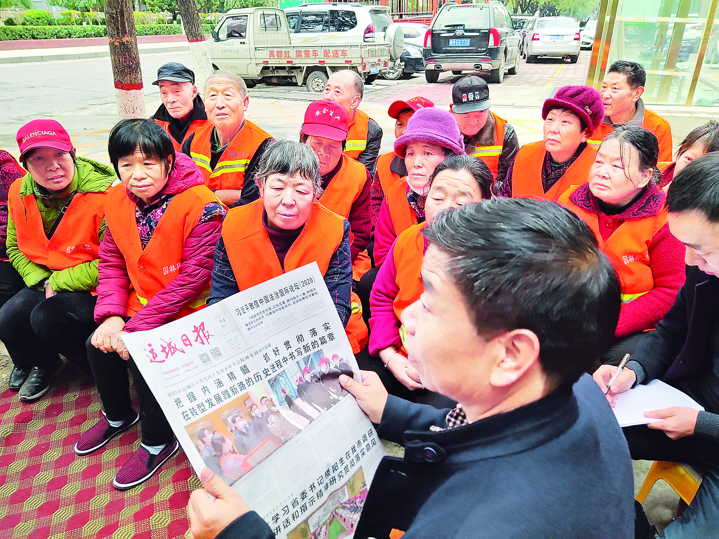 11月18日,运城经济技术开发区建设事业部工作人员在为环卫工人宣讲党的十九届五中全会精神。运城经开区组织人员进企业、入商户,认真宣讲党的十九届五中全会精神,为基层工作注入正能量和新动力,夯实高质量转型发展的“底盘支撑”。(王军鸽 吉永峰)