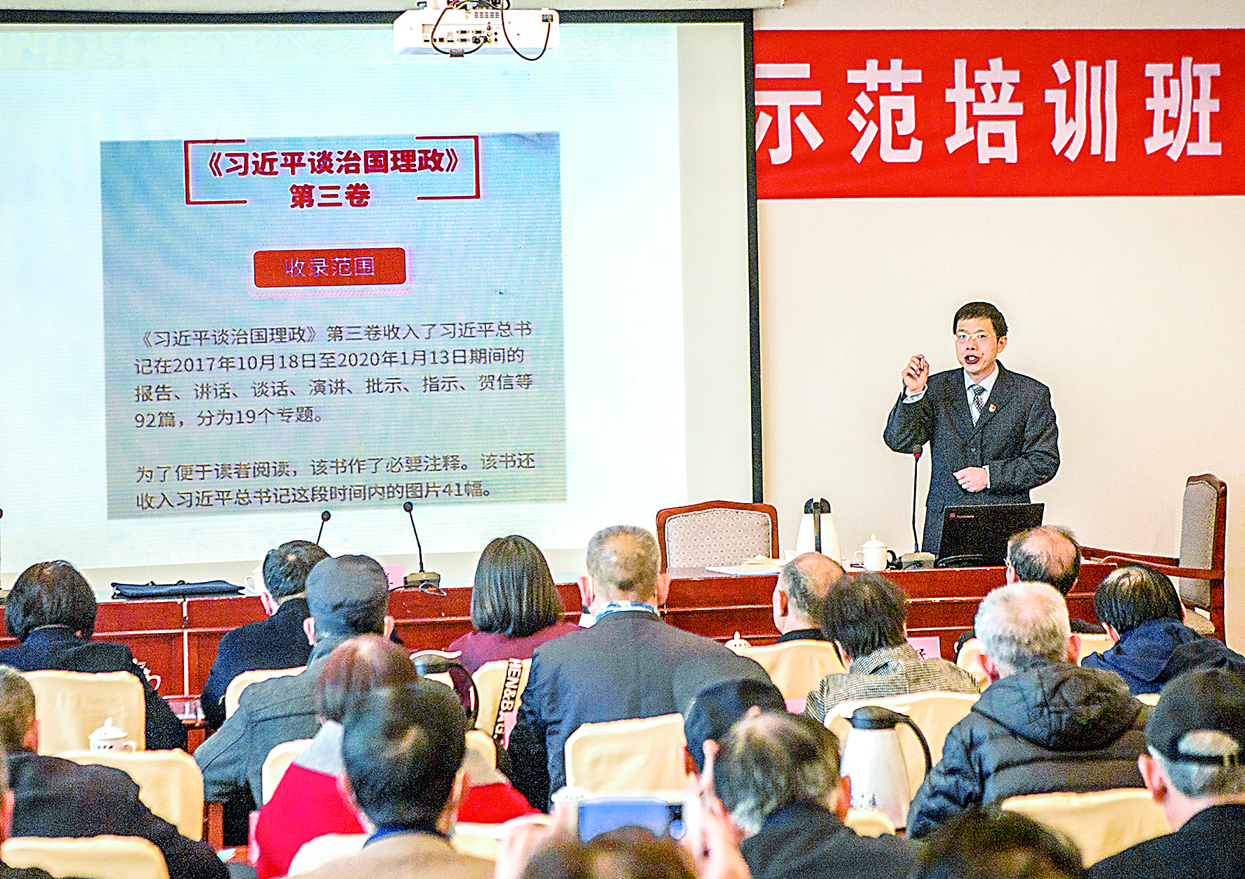11月13日,一位市委党校教授在辅导各县(市、区)老干部局的党务干部学习党的十九届五中全会精神。 当日,由市委老干部局举办的为期两天的“离退休干部党组织书记示范培训班”在运城宾馆进行。60多名党务干部参加了培训和测试,他们将成为向全市离退休干部宣讲全会精神的骨干力量。 (特约摄影 李克荣)