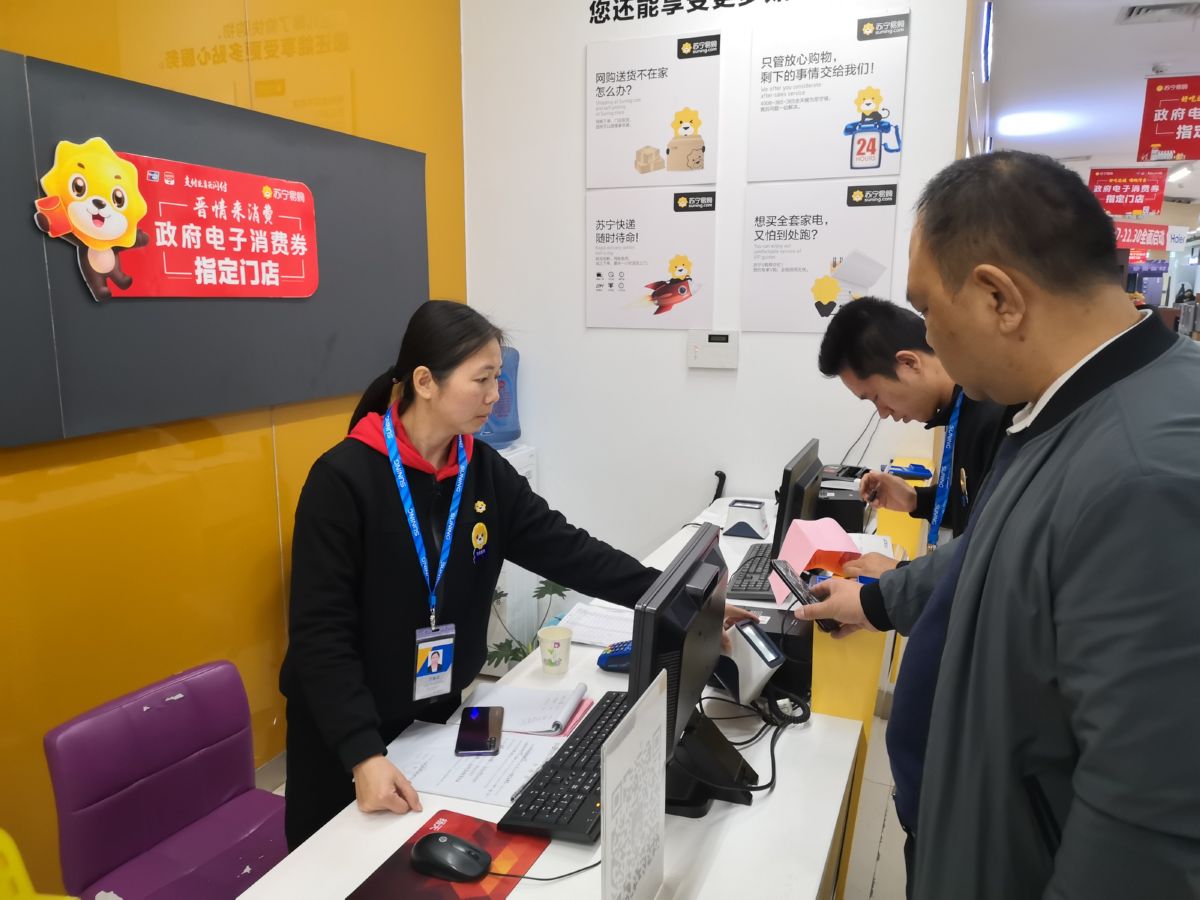 ▲11月18日,顾客在市区南风广场的苏宁易购门店使用消费券结账。 裴旭薇 摄
