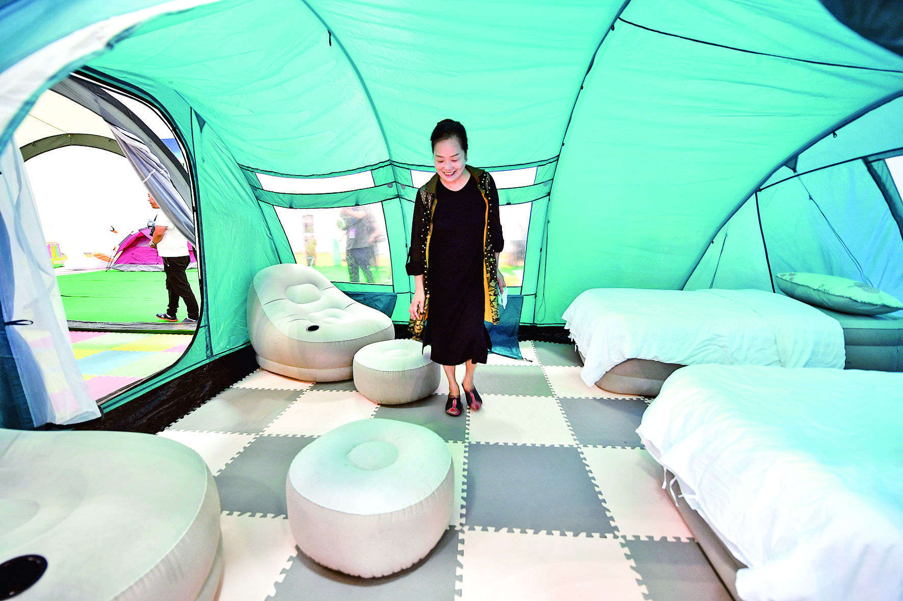 11月19日,观众在参观展会中展示的一顶露营帐篷。