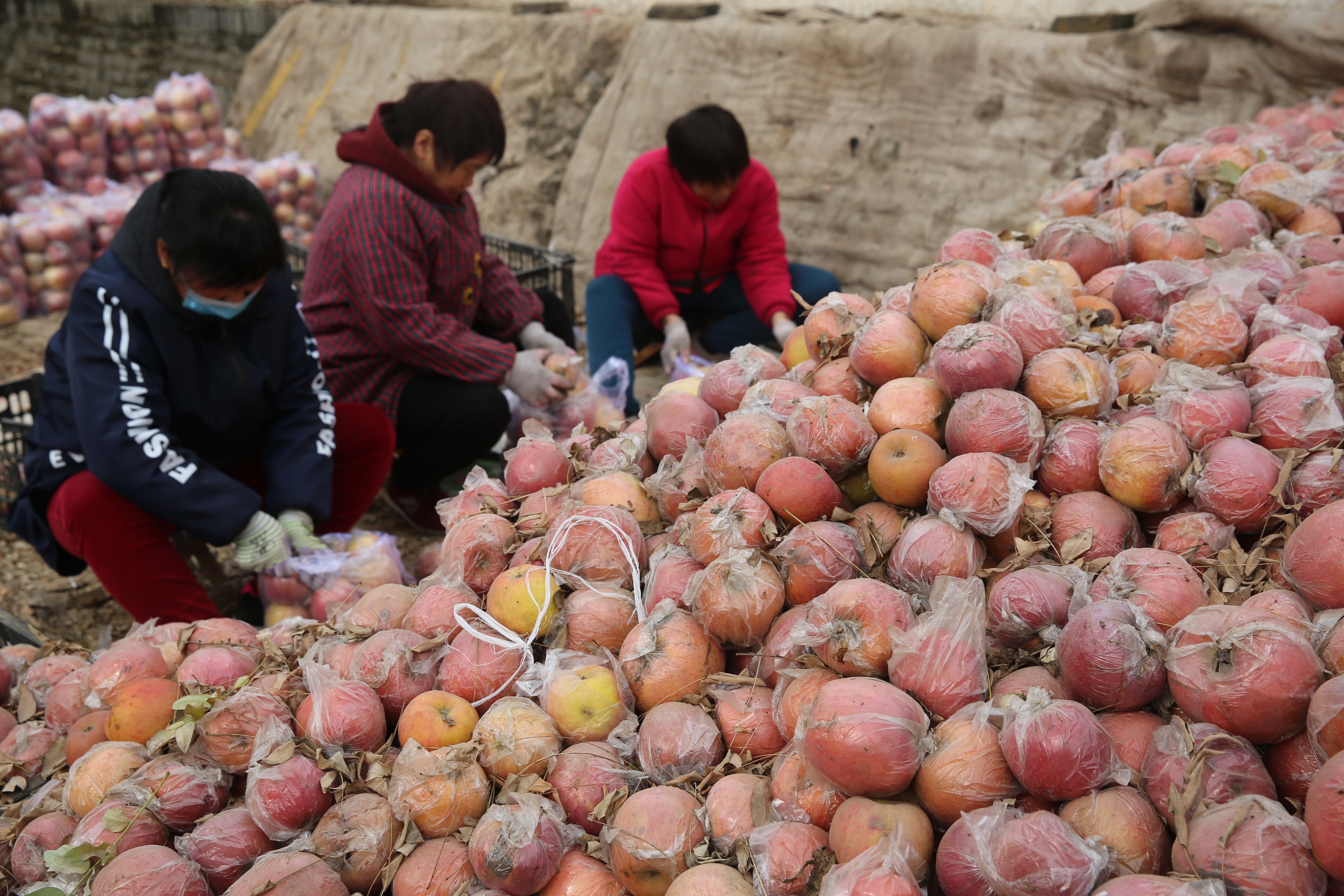▲11月28日,临猗县耽子镇卓里村村民黄勋的果库旁,几名“果嫂”在给“富士”晚熟苹果分级、整理和装筐,等待外运销售。 近日,在果业大县临猗县,“果嫂”们巧变冬闲为冬忙,奋力拓宽妇女就业渠道。 特约摄影 薛启涛
