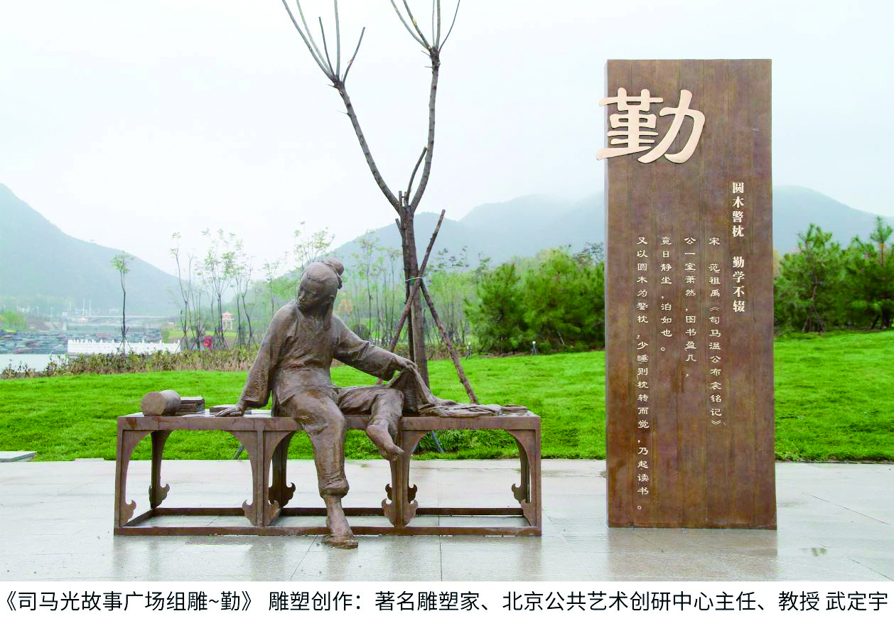 铜雕地铺复原了司马光《资治通鉴》一页手稿,让人们近距离感受司马光《资治通鉴》原貌,似船似叶的不锈钢作品上镌刻着警世名言,又可以让人们在大自然中映照出自我形象,以史为鉴。