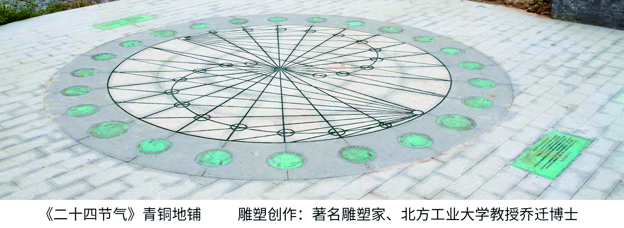 本雕塑中间为石雕“二十四节气黄道图”,周围一圈为二十四节气铜雕地铺。