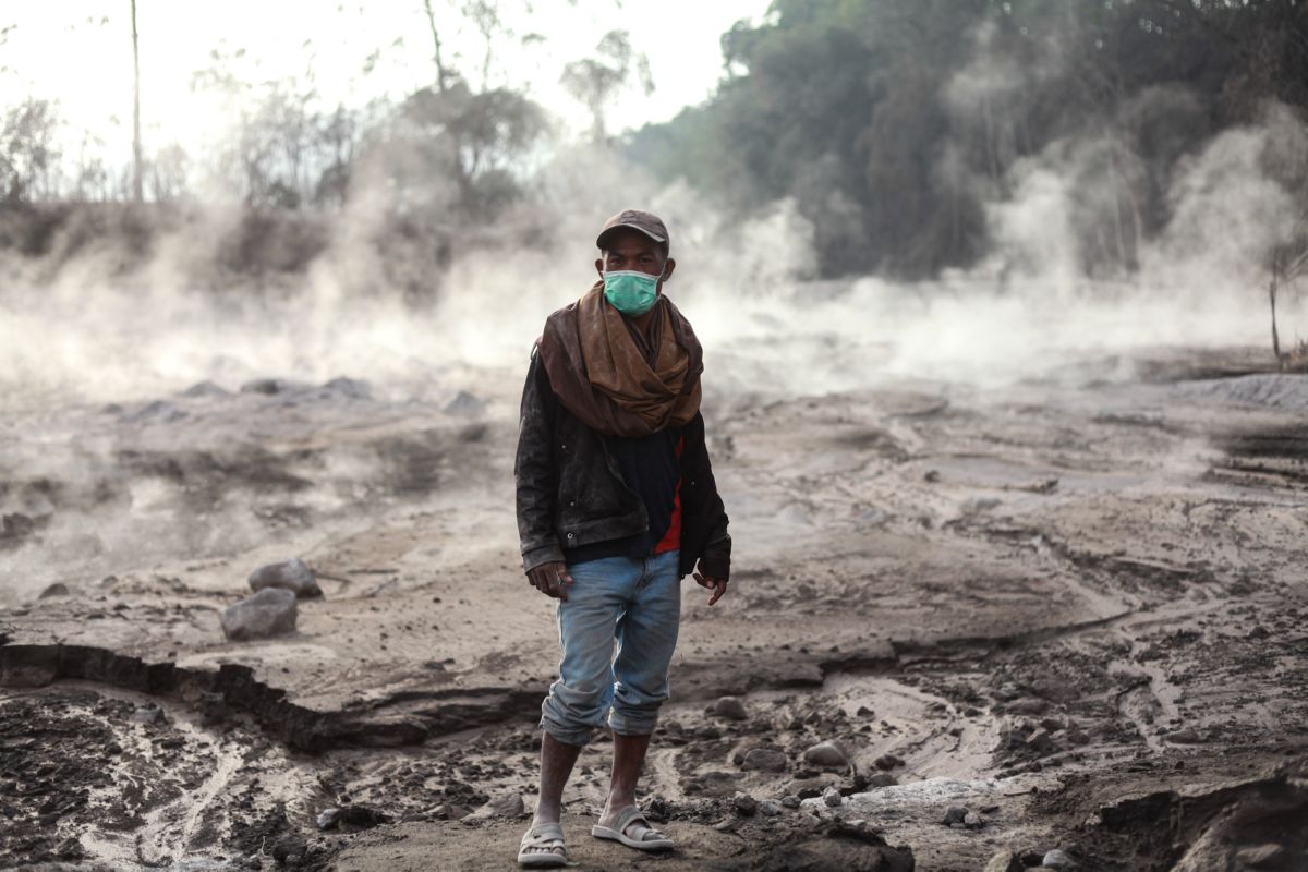 ▲12月2日,在印度尼西亚东爪哇省卢马姜地区,一名面戴口罩的当地居民站在仍有余温的火山灰上。