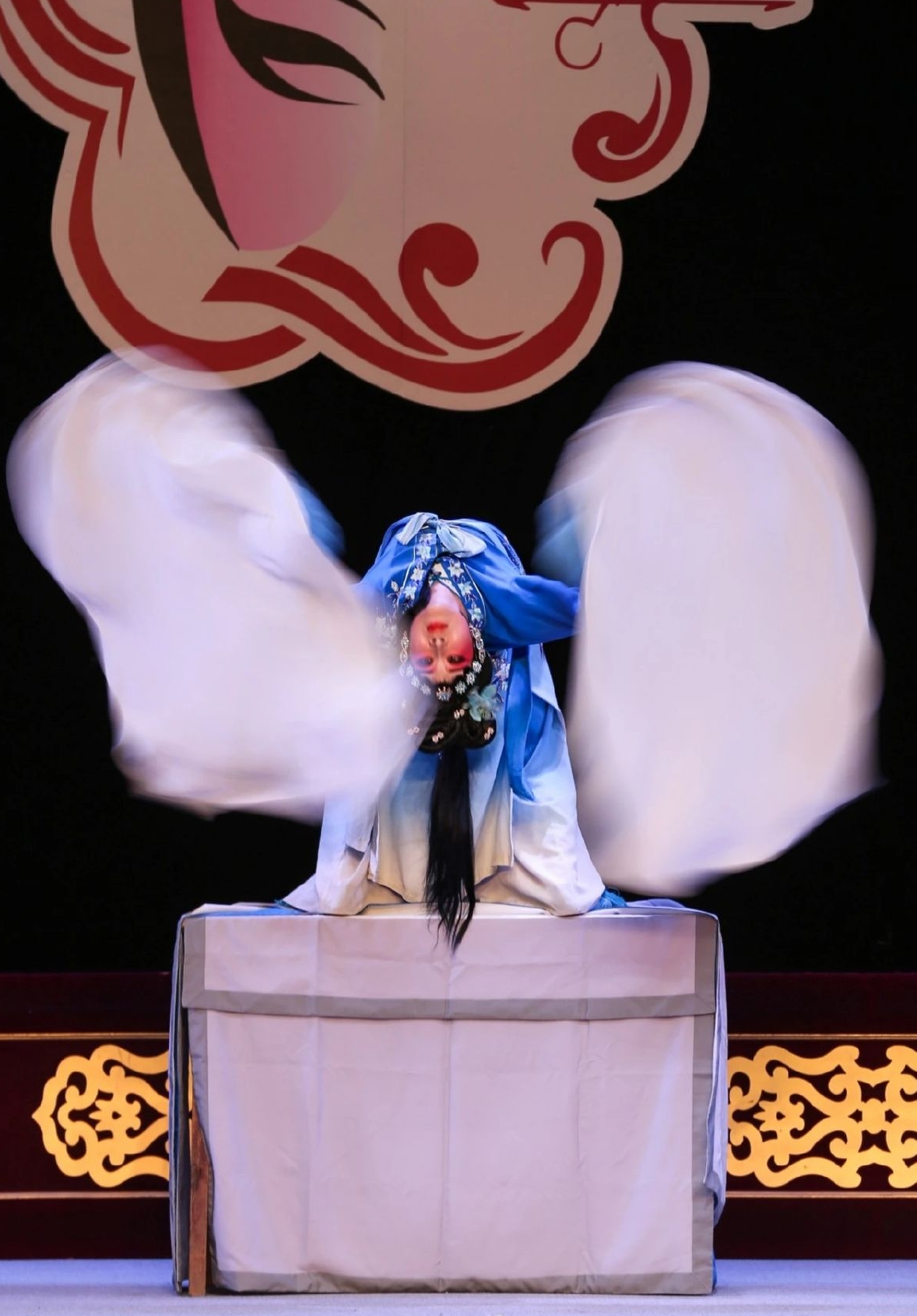 稷山县蒲剧团28岁的武生新秀李志辉表演的是《伐子都》。剧中,春秋郑国副帅子都因嫉妒,暗害元帅考叔并冒其功,在庆功宴上酒后吐露实情。其羞愧身亡时对桌子穿爬、高台倒首虎、僵尸等高难特技运用准确、娴熟,令人称绝!