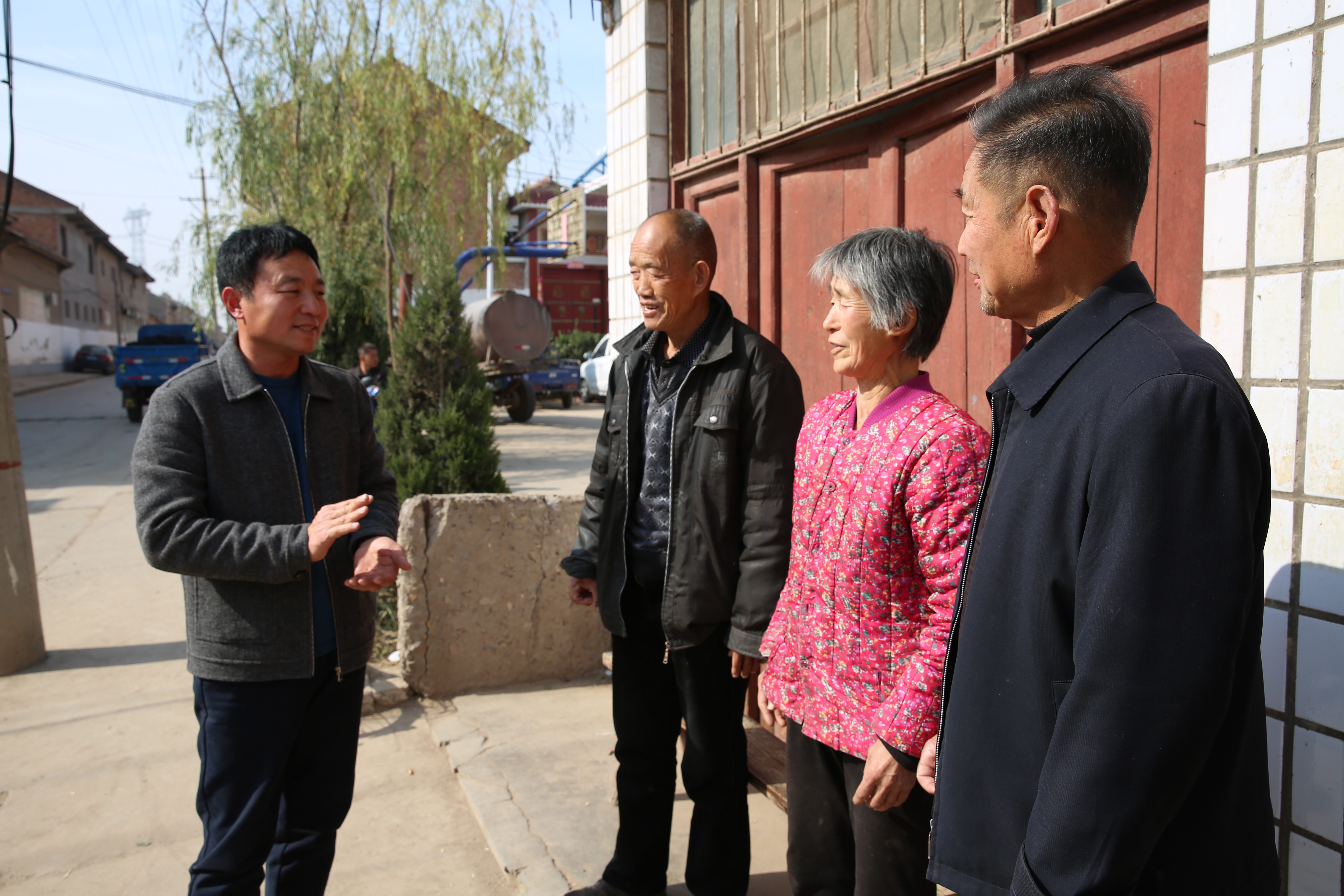 ▲王义东(左一)与村民拉家常 记者 张国平 摄