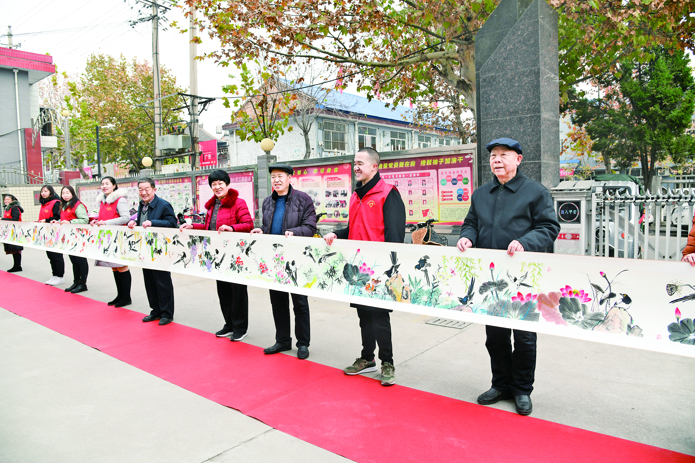 通过侯月武的介绍,志愿者们被其创作的《百喜图》吸引了。该作品是侯月武精心构思,历时1个多月才完成的,长达38米。