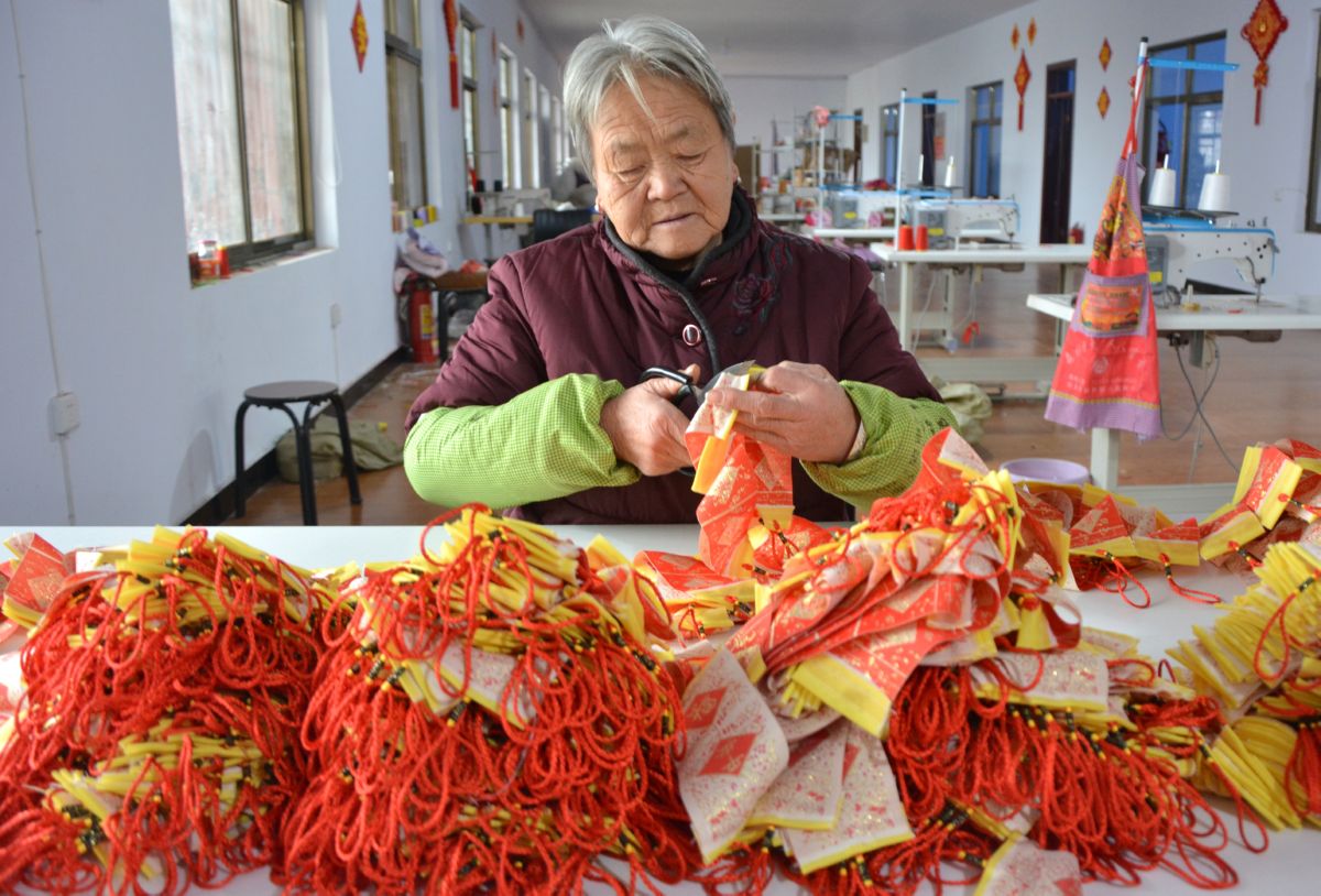 12月5日,垣曲县皋落乡岭回村扶贫车间内,73岁的王梅在制作香囊挂件。