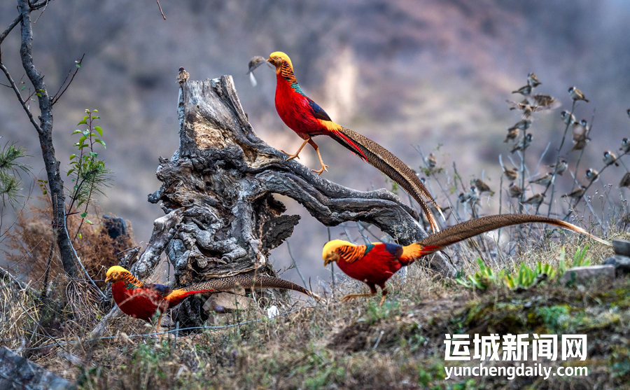 12月4日,几只红腹锦鸡在盐湖区中条山腹地的山间觅食。