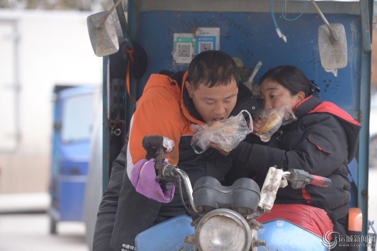杨芬艳哪顾得上吃饭,赵海峰忙着填写打印单子,杨芬艳忙着整理即将发出的包裹,帮着贴单。忙完这些后,两人才坐在快递车上一起吃午饭。杨芬艳一手拿饼自己吃,一手递饼喂丈夫。看见记者在一旁拍照,赵海峰开玩笑地说:“把我媳妇拍漂亮点啊!”