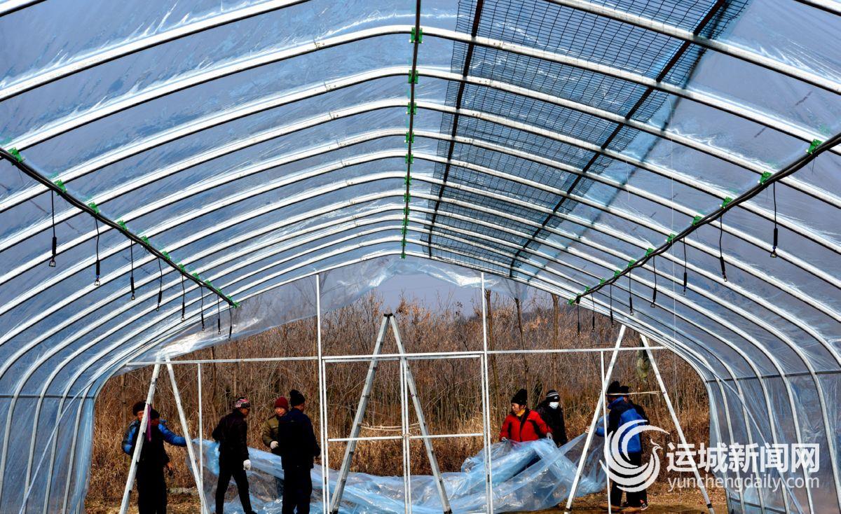 12月9日,垣曲县特色食用菌基地建设工地,村民在为拱棚盖膜。
