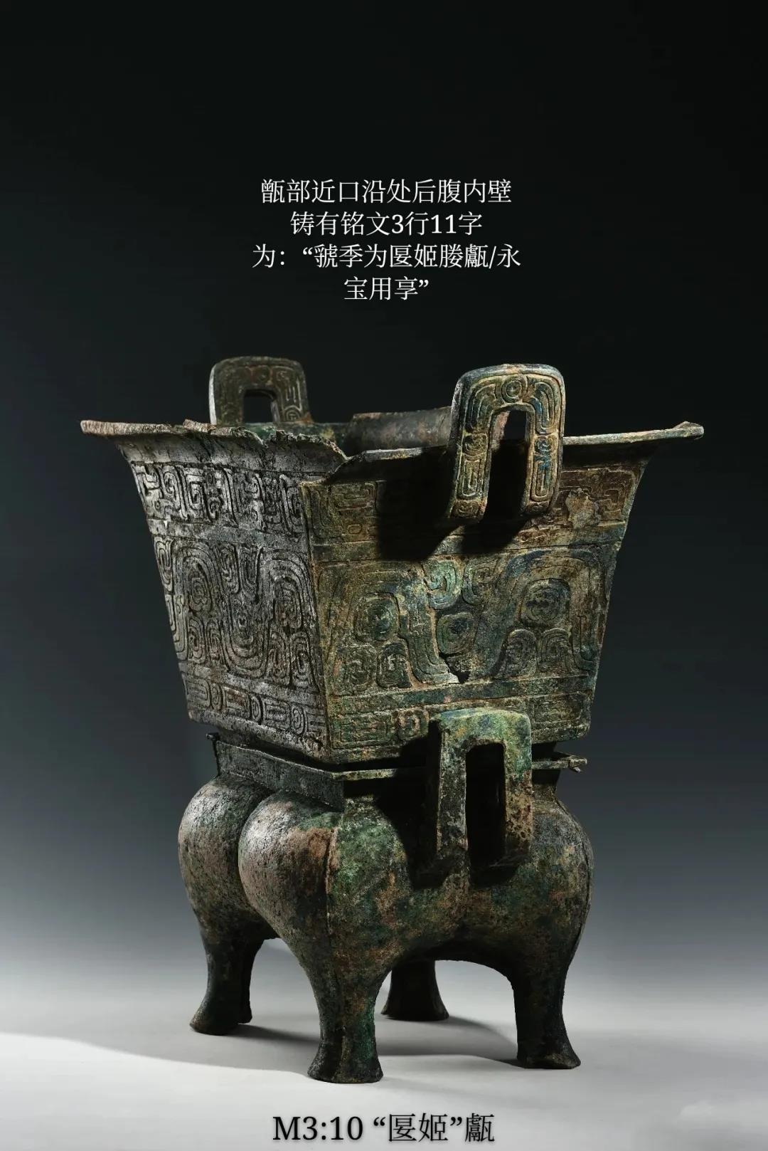 此次发掘的墓葬级别高、规模大,出土器物种类丰富,包括铜、玉、石、漆、陶、骨、蚌贝、铅、金等各类文物总计500余件套。其中,礼器类有鼎、甗、簋、盨、铺、罐等,礼乐器有编钟和石磬。最重要的收获是发现带有铭文的铜器近50件套,铭文内容丰富,文字清晰,计14篇。