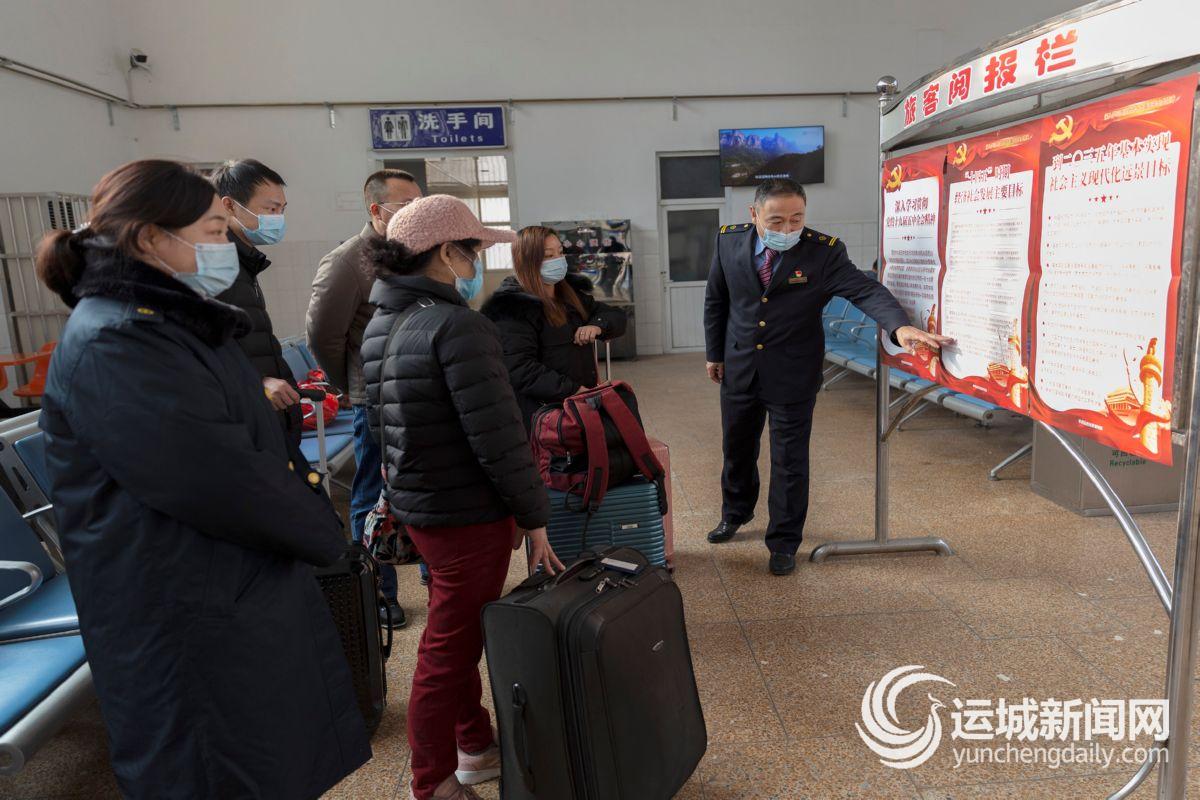 永济火车站候车厅工作人员向候车旅客宣讲党的十九届五中全会精神。