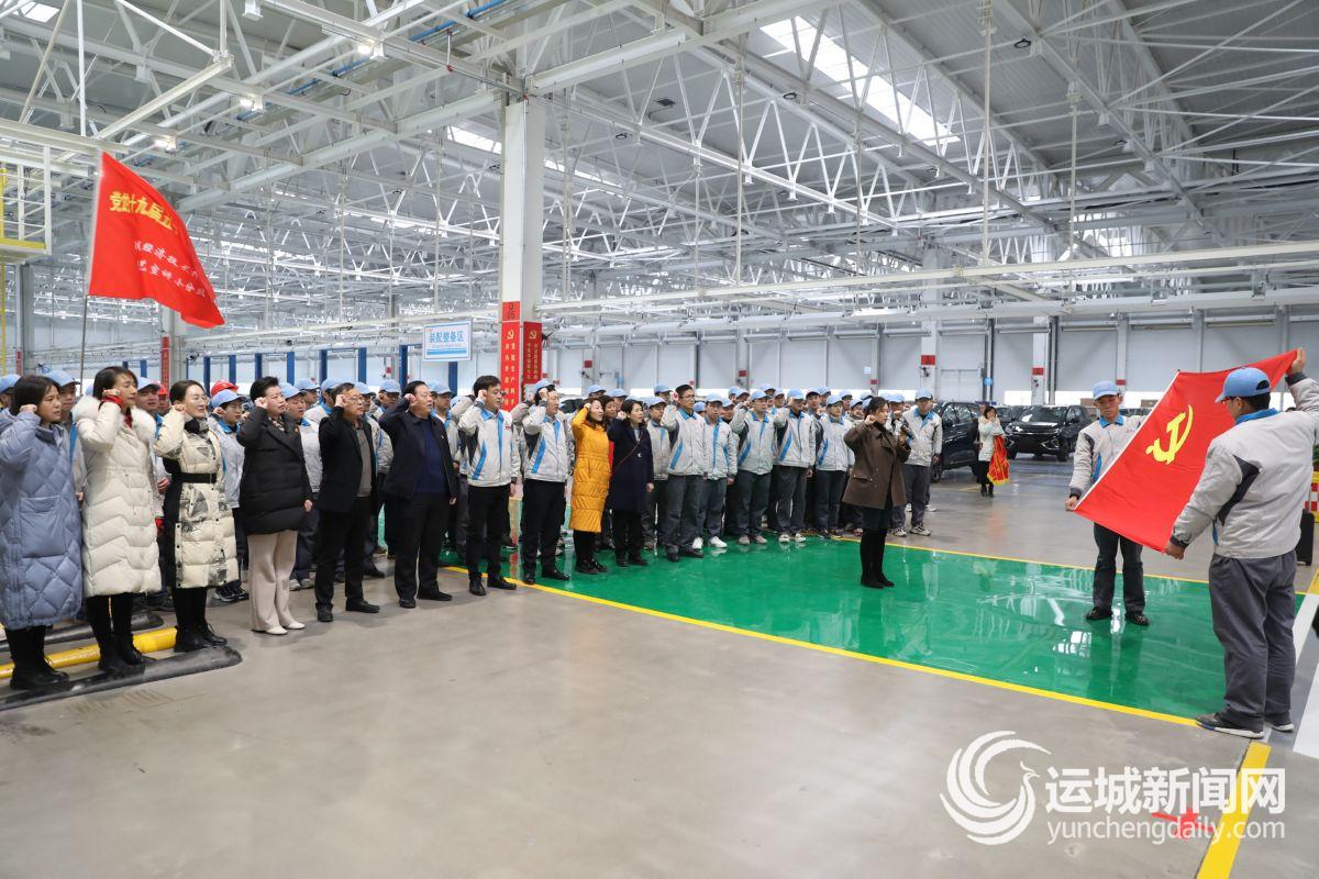 运城经开区党工委书记、管委会主任王建军与大运新能源汽车生产基地工人一起重温入党誓词