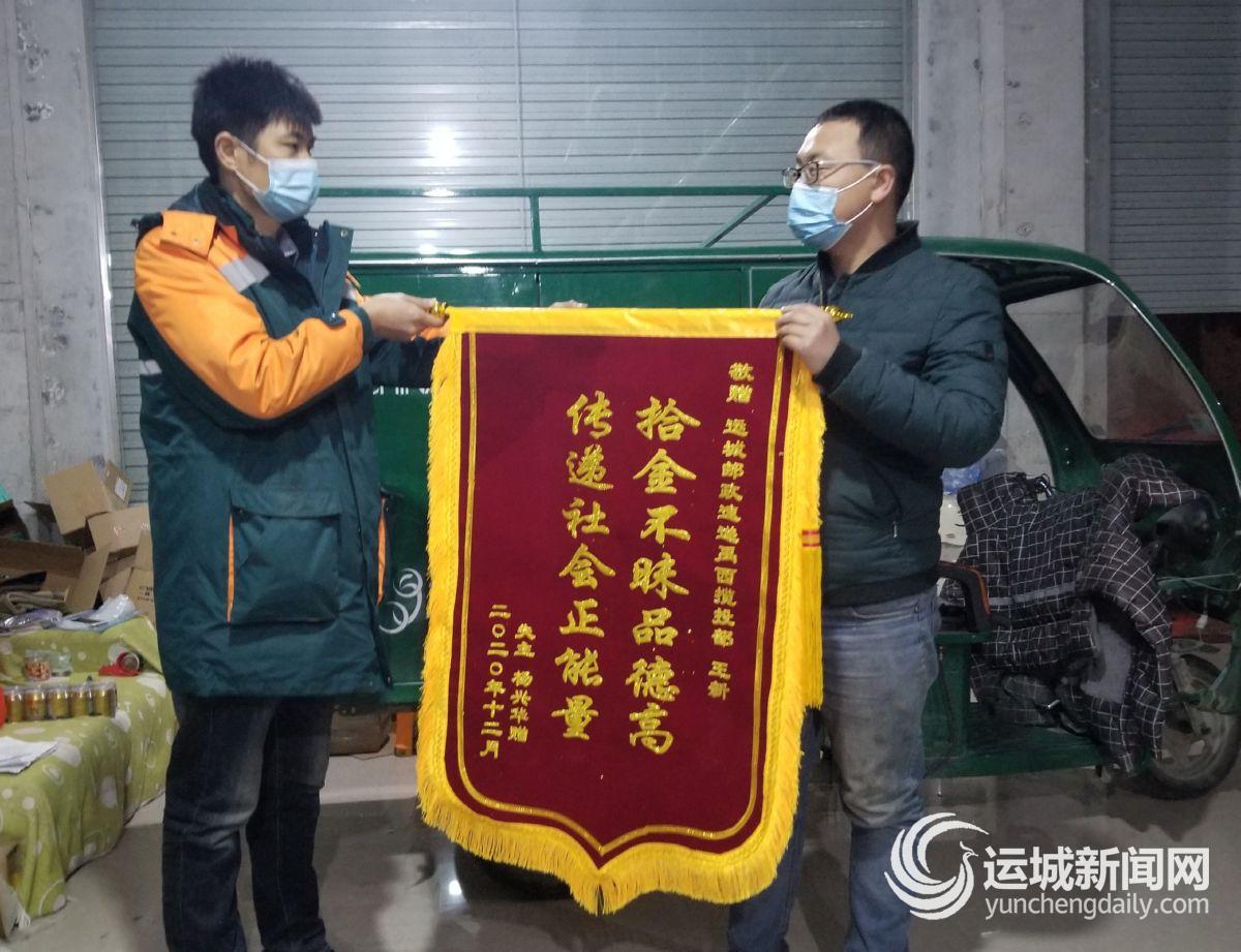 运城晚报讯(记者 范楚乔)“您捡到包后及时归还,我们非常感谢……”12月11日,拾金不昧的邮政快递小哥王新,收到了失主李女士家人的当面致谢以及一面致谢锦旗。