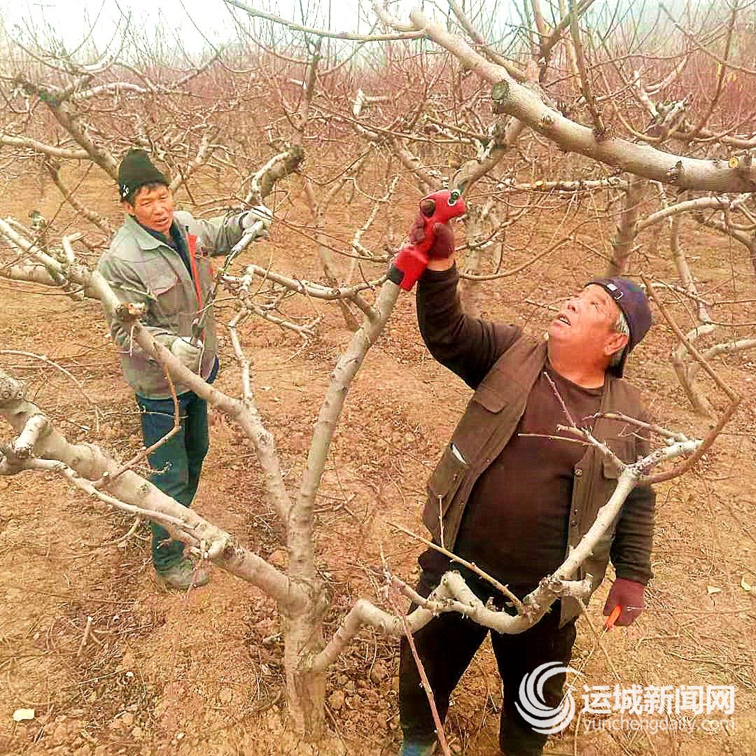 12月11日,夏县尉郭乡阴庄村村民张恩红等人在瑶峰镇北山底村为当地村民修剪桃树、杏树。