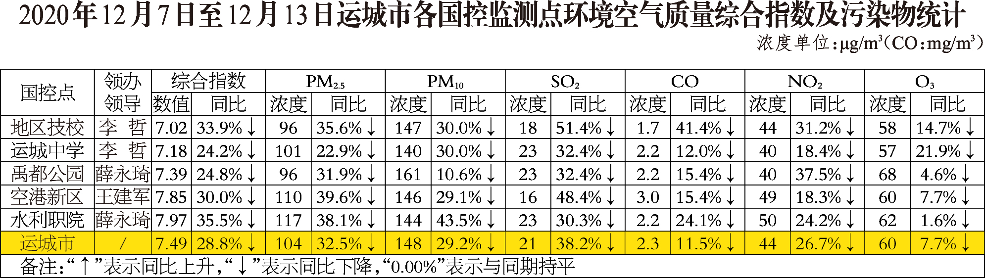 根据《运城市国控监测点“一点一管控”考核方案》要求,现将2020年12月7日至13日中心城区5个国控监测点环境空气质量通报如下(单位:微克/立方米):