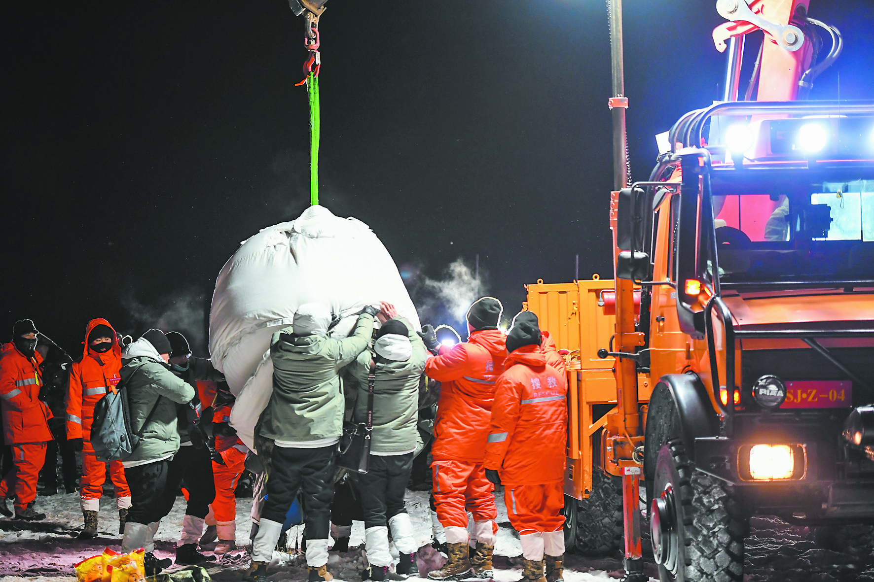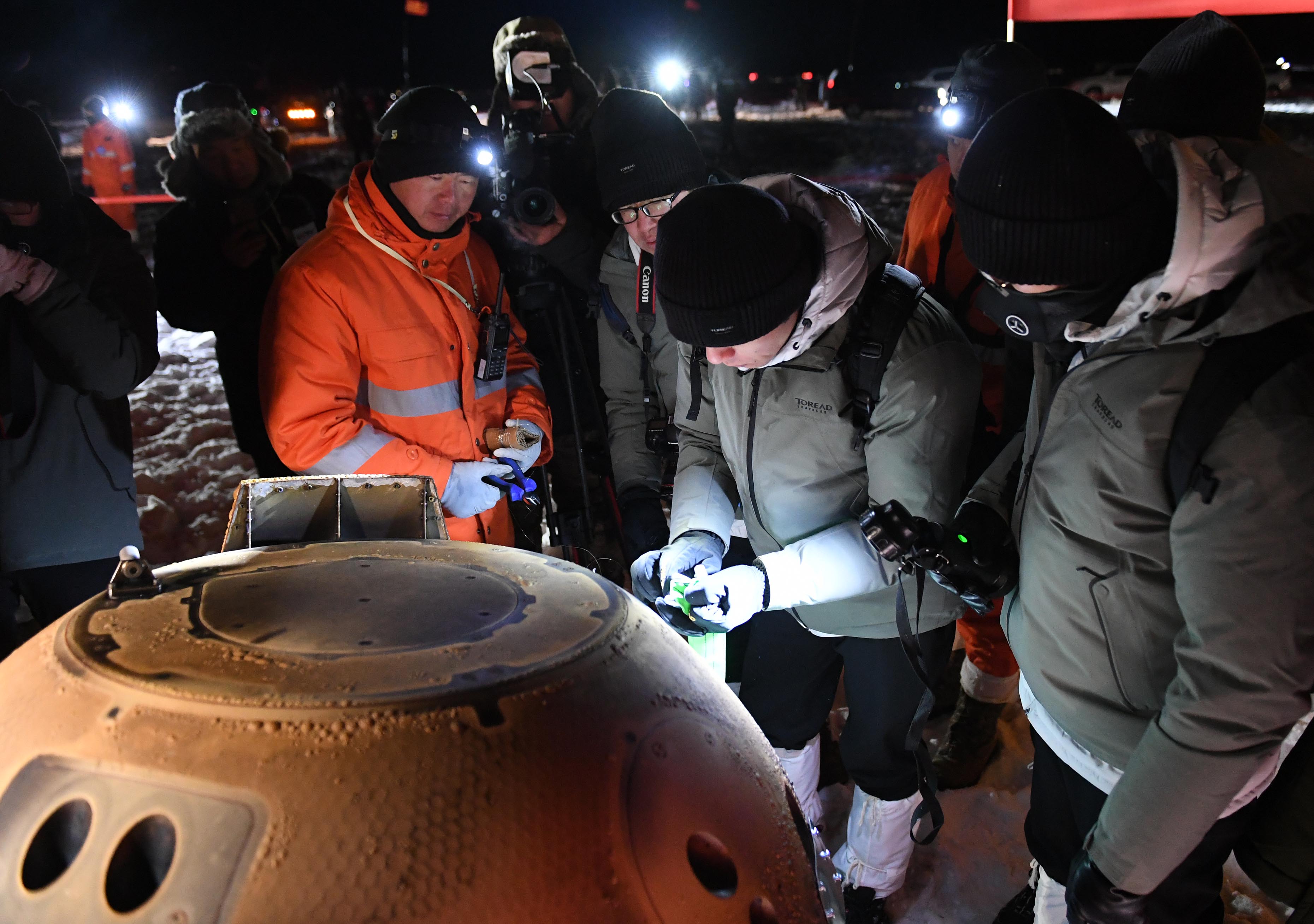 12月17日,工作人员在搬运嫦娥五号返回器。 12月17日凌晨,嫦娥五号返回器携带月球样品,采用半弹道跳跃方式再入返回,在内蒙古四子王旗预定区域安全着陆。新华社记者 彭源 摄