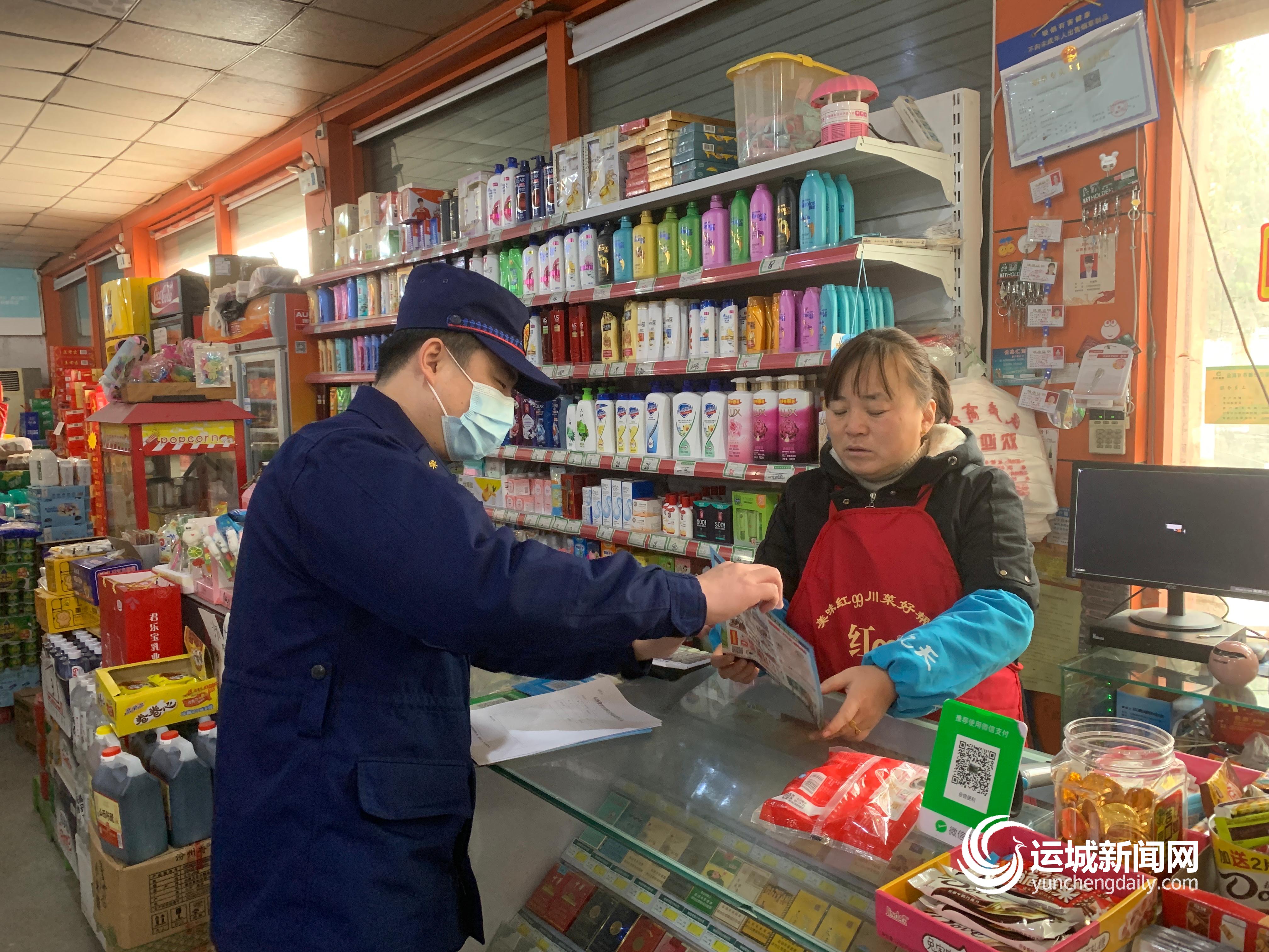 ▲消防宣传人员入商铺发放宣传资料 寻霄 摄