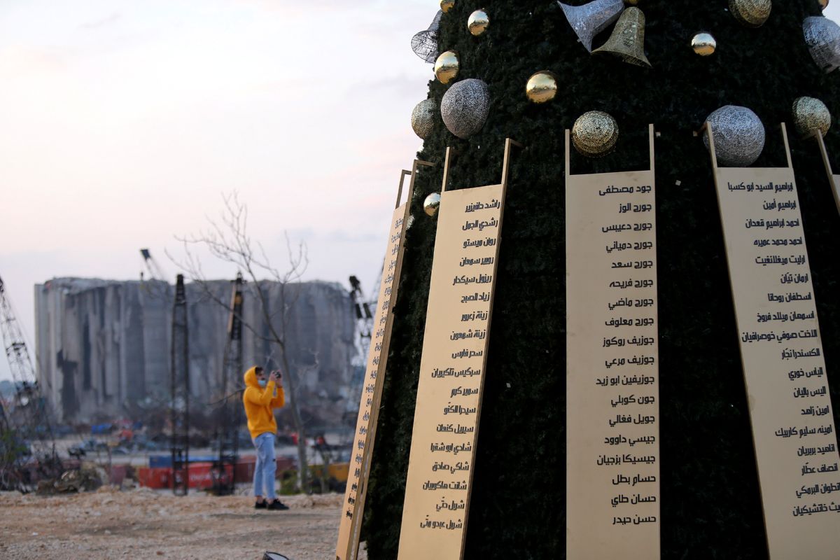 ▲12月22日,黎巴嫩贝鲁特港口爆炸废墟附近一棵圣诞树上面挂着爆炸中死难者的名字。贝鲁特港口区8月4日发生剧烈爆炸,造成至少190人死亡、6500多人受伤。 新华社发(比拉尔·贾维希 摄)
