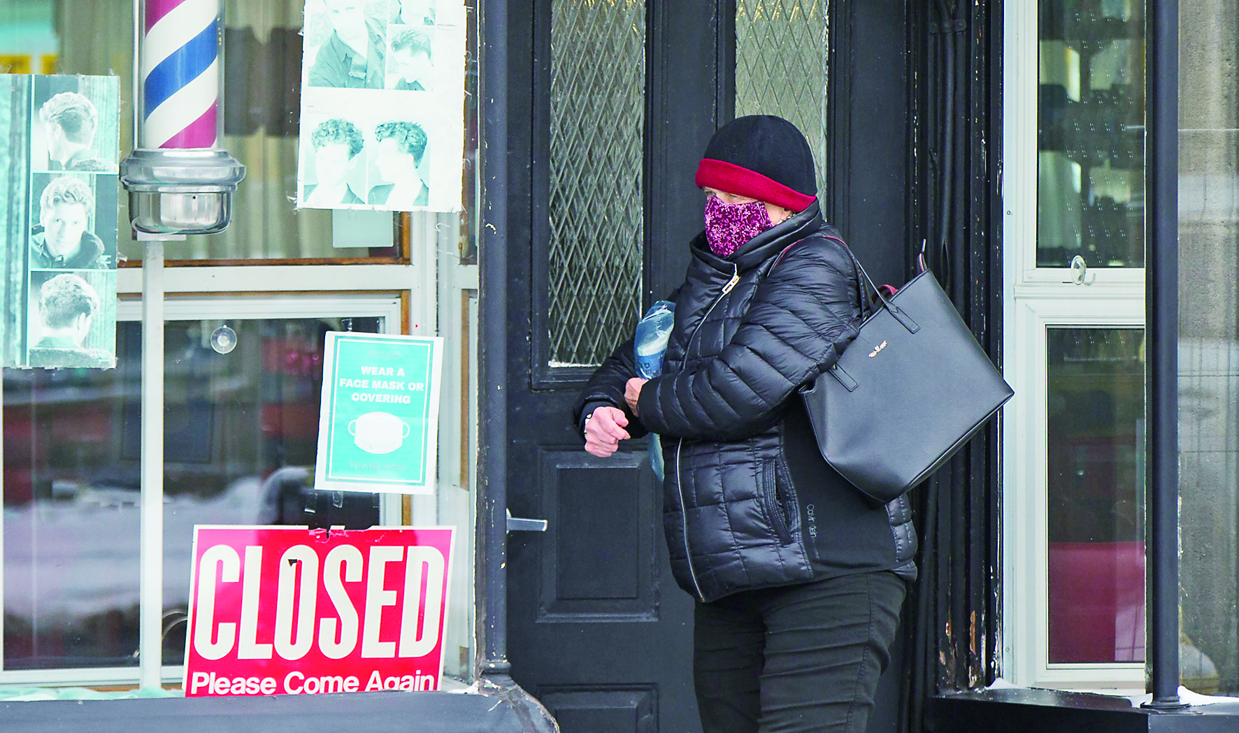 12月26日,在加拿大多伦多,一名戴口罩的女子经过暂停营业的理发店。为遏制新冠疫情蔓延,加拿大人口最多省份安大略省当日在全省范围内实施封城措施,非必需商店暂停营业并禁止室内活动与社交聚会等。 新华社发(邹峥 摄)