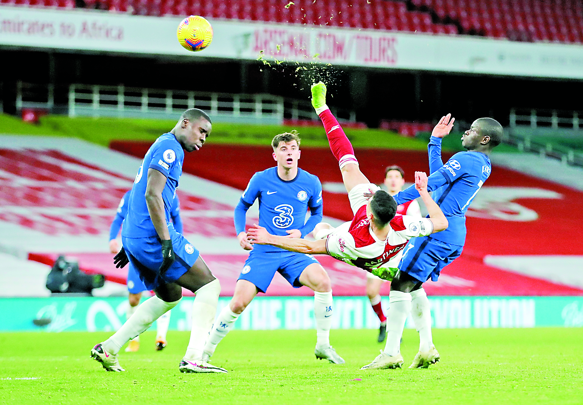 12月26日,切尔西队球员马丁内利(右二)在比赛中倒钩射门。 新华社/路透