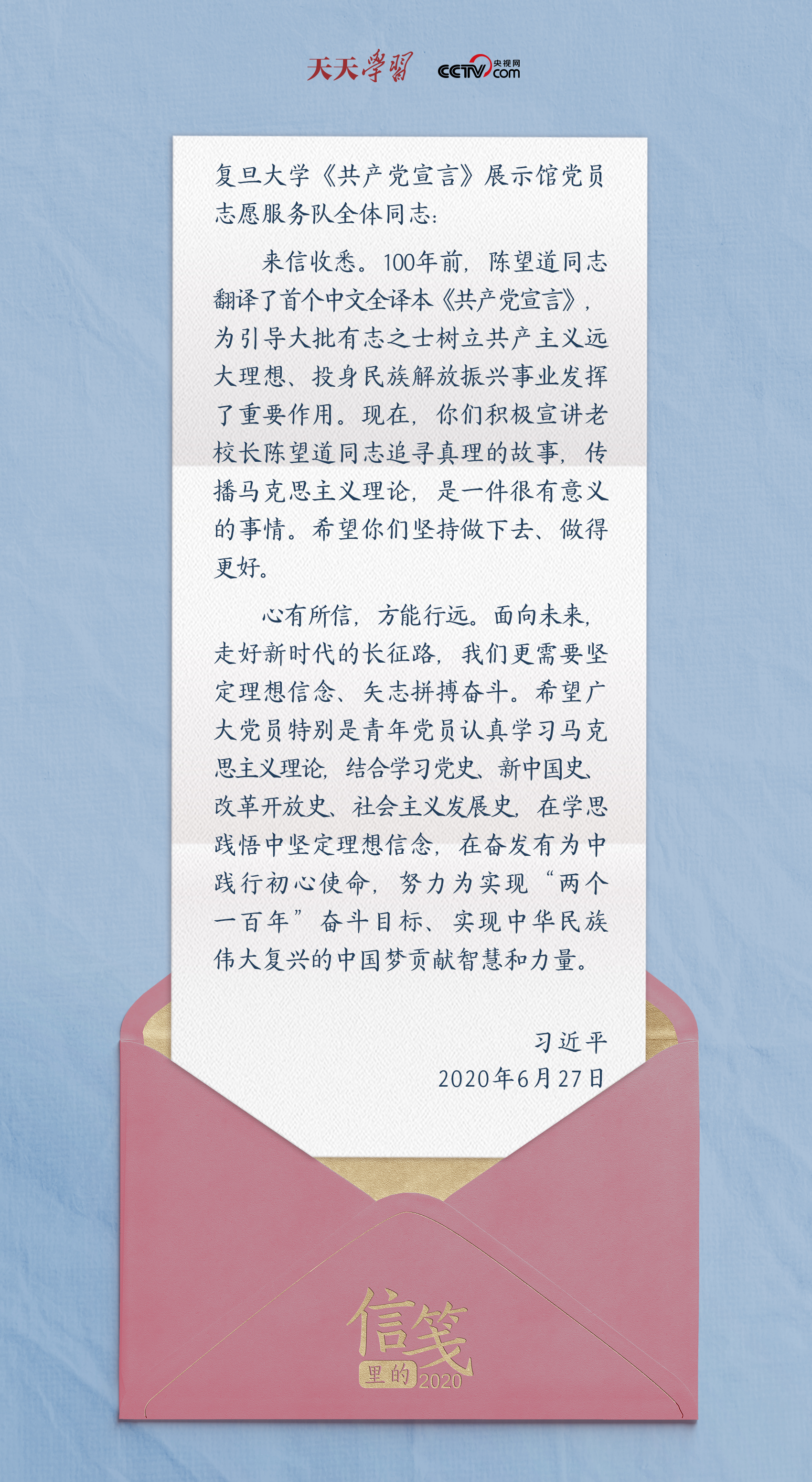 今年夏天,党员志愿服务队的30名队员给习近平总书记写了封信,汇报了参加志愿讲解服务的经历和体会,并表达了做《共产党宣言》精神忠实传人的信心和决心。