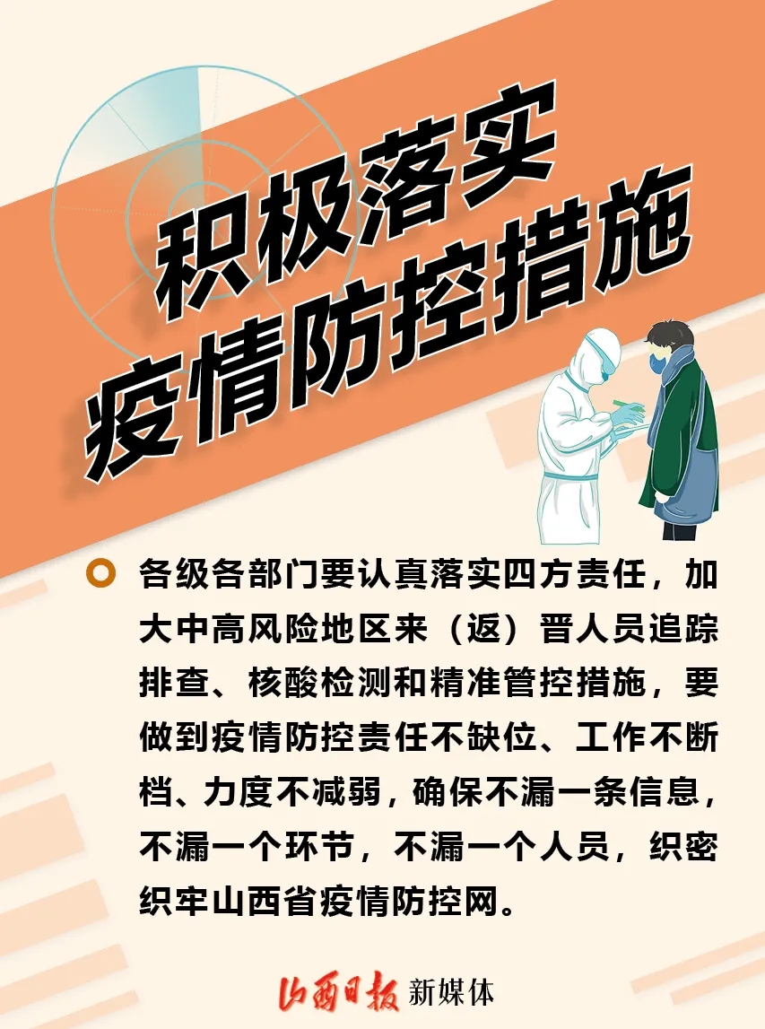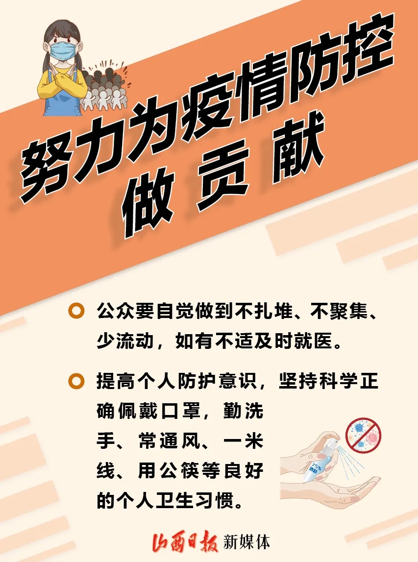 2021年元旦、春节将至,为科学精准果断做好山西省常态化疫情防控工作,严格执行“外防输入、内防反弹”防控策略,坚持“人物同防”“多病共防”原则,严把“境外输入”“省外输入”“冷链输入”三个关口,确保全省人民度过一个健康、欢乐、详和的节日,省新冠肺炎疫情防控办再次发布提示。