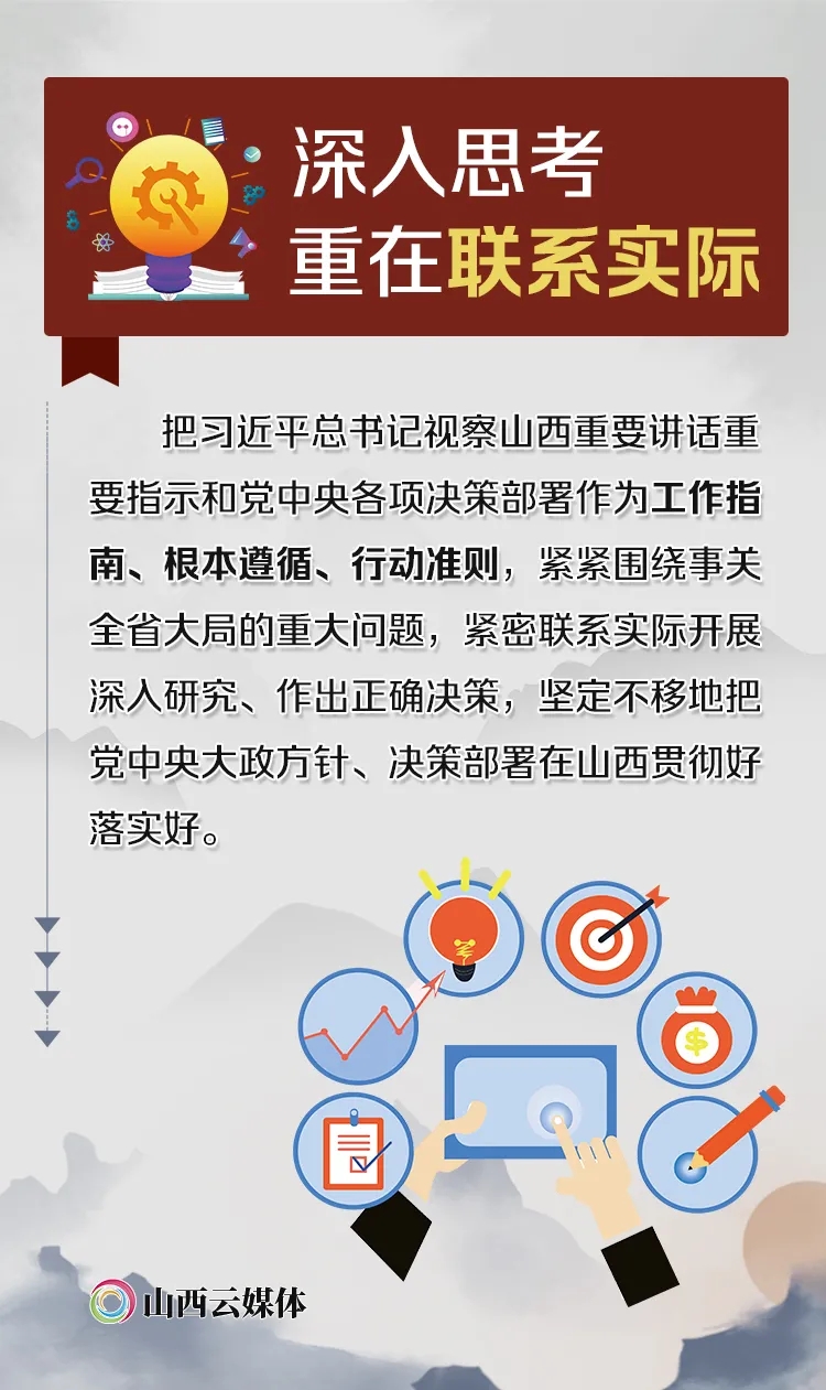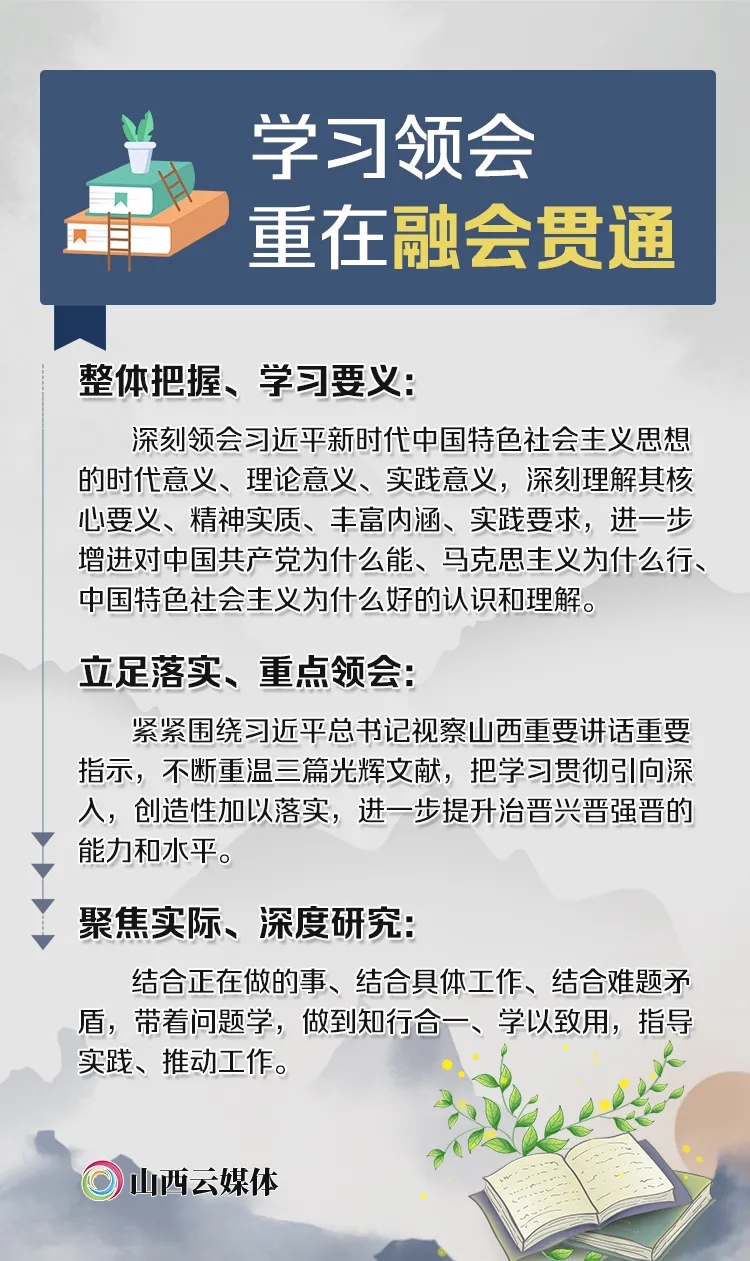 省委书记楼阳生强调,要以习近平新时代中国特色社会主义思想为指导,把学习贯彻《习近平谈治国理政》第三卷与第一卷、第二卷作为一个整体,与学习贯彻党的十九大和十九届二中、三中、四中、五中全会精神结合起来,与学习贯彻中央经济工作会议精神结合起来,与贯彻落实习近平总书记视察山西重要讲话重要指示结合起来,知行合一、学以致用,进一步增强“四个意识”、坚定“四个自信”、做到“两个维护”,完成好在转型发展上率先蹚出一条新路来的历史使命。