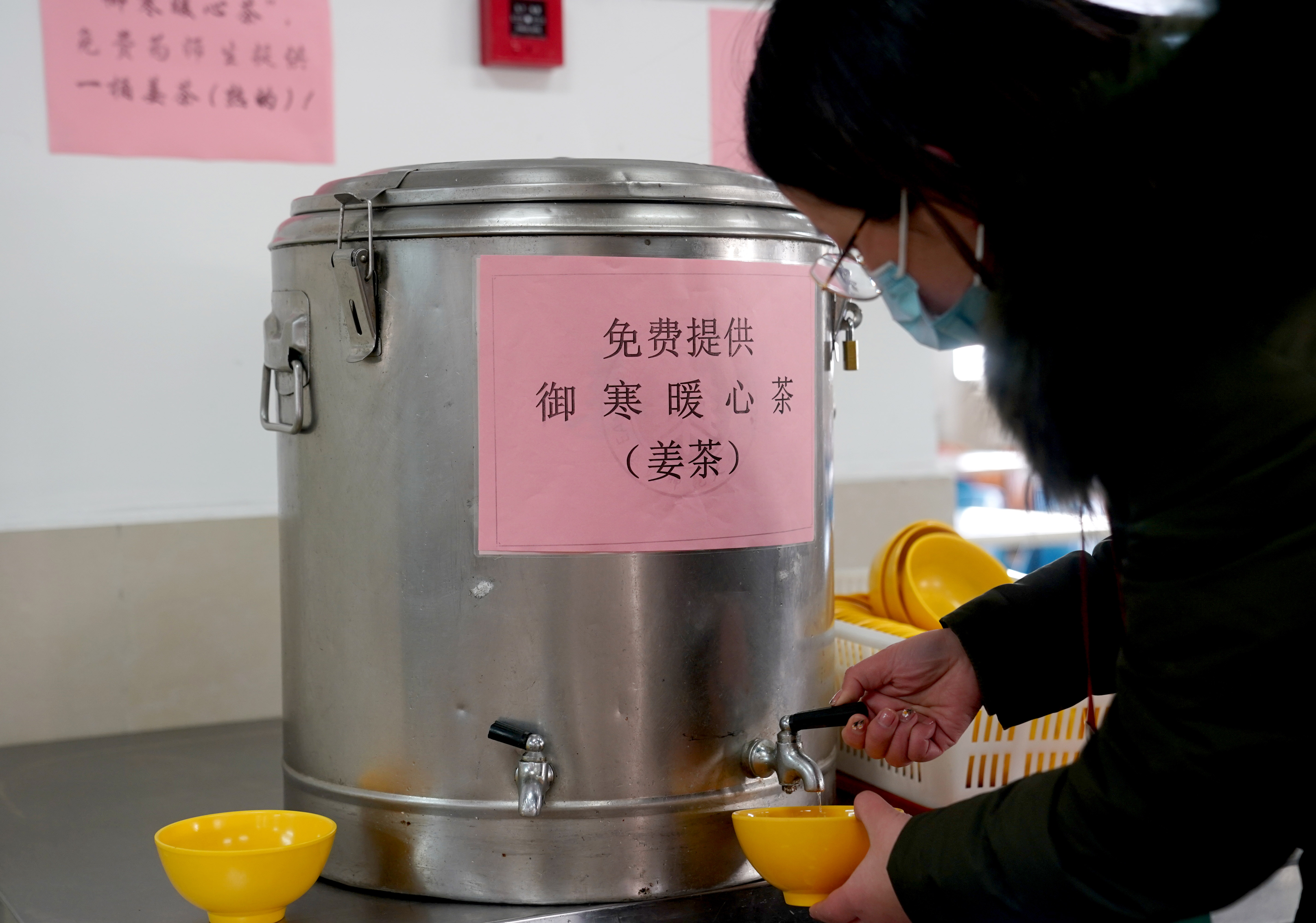 12月30日,华东师范大学的食堂免费供应热姜茶,供师生们暖身。 当日,上海中心气象台发布道路结冰、低温、寒潮、大风等四项灾害天气预警。上海各高校从信息预警、物资准备、设施保护、人性化服务等方面采取措施,全力保障校园管理和师生工作生活的安全有序。 新华社记者 刘颖 摄