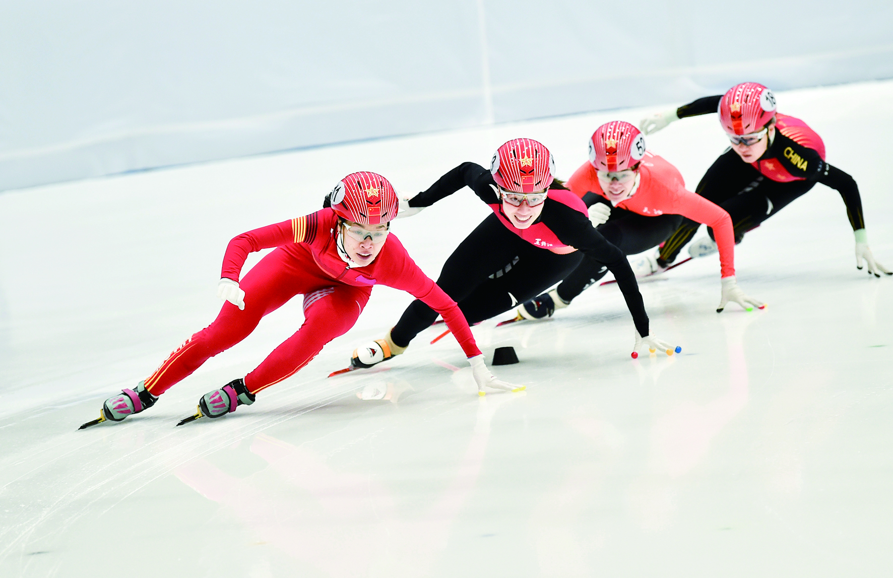 1月4日,黑龙江省冰上训练中心选手徐爱丽(左一)、曲春雨(左二)在女子500米决赛中。