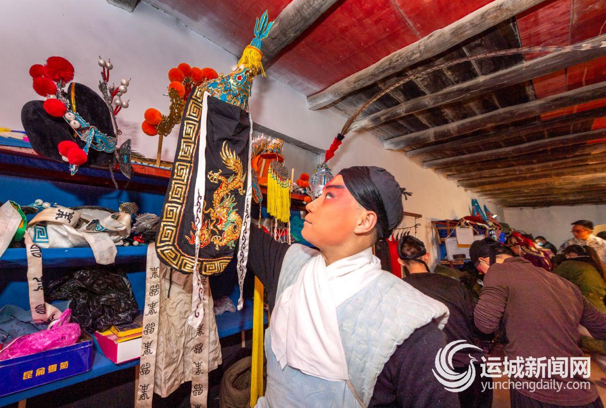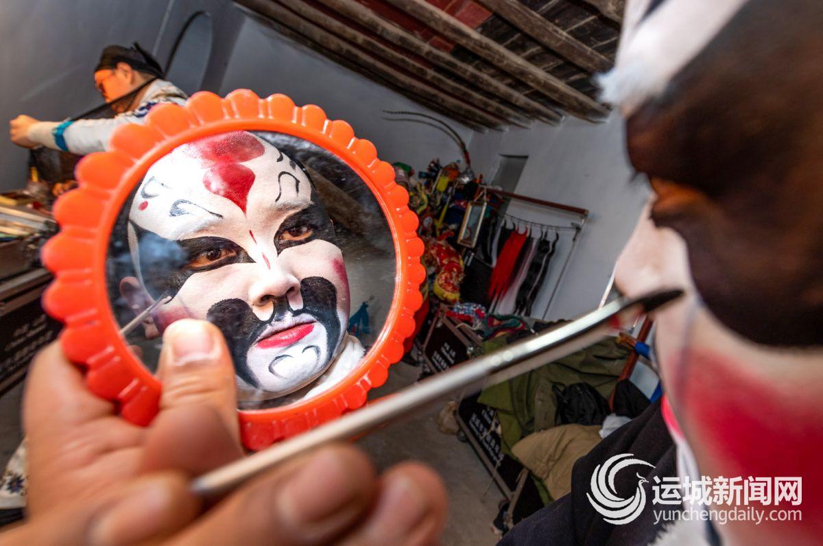 1月3日,演员在后台化妆,准备为平陆县洪池乡的村民表演蒲剧《辕门斩子》。