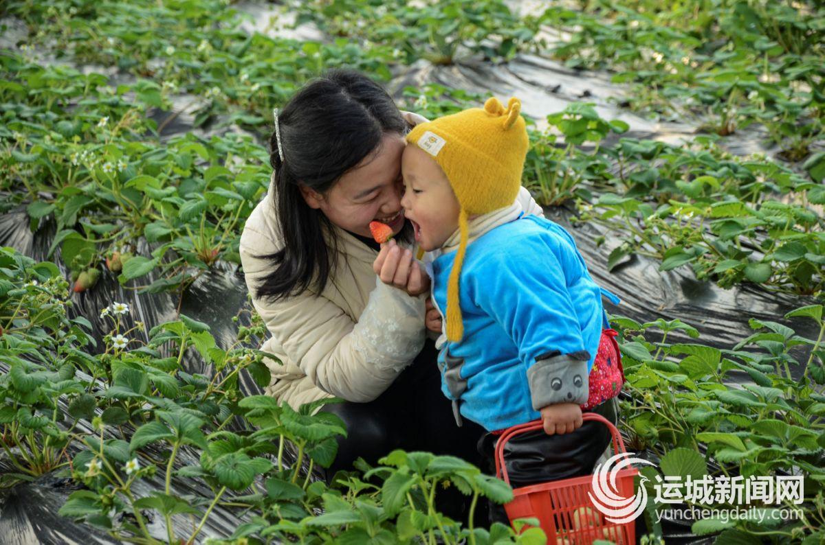▲1月3日,游客带着孩子在芮城县红河谷家庭农场摘草莓,在元旦假期里享受采摘快乐。