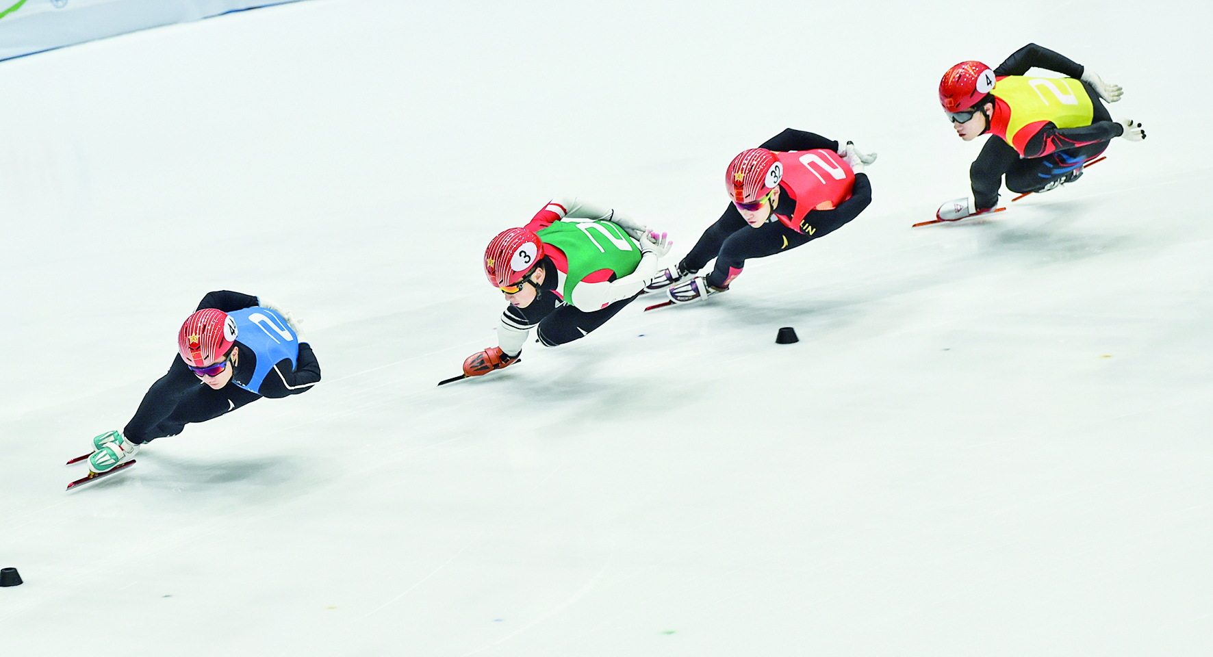 1月5日,山东省代表队选手李文龙(左一),吉林省冰上中心队选手任子威(左二),吉林省体校队选手张添翼(右二),北京市体育局队选手李孔超(右)在比赛中。