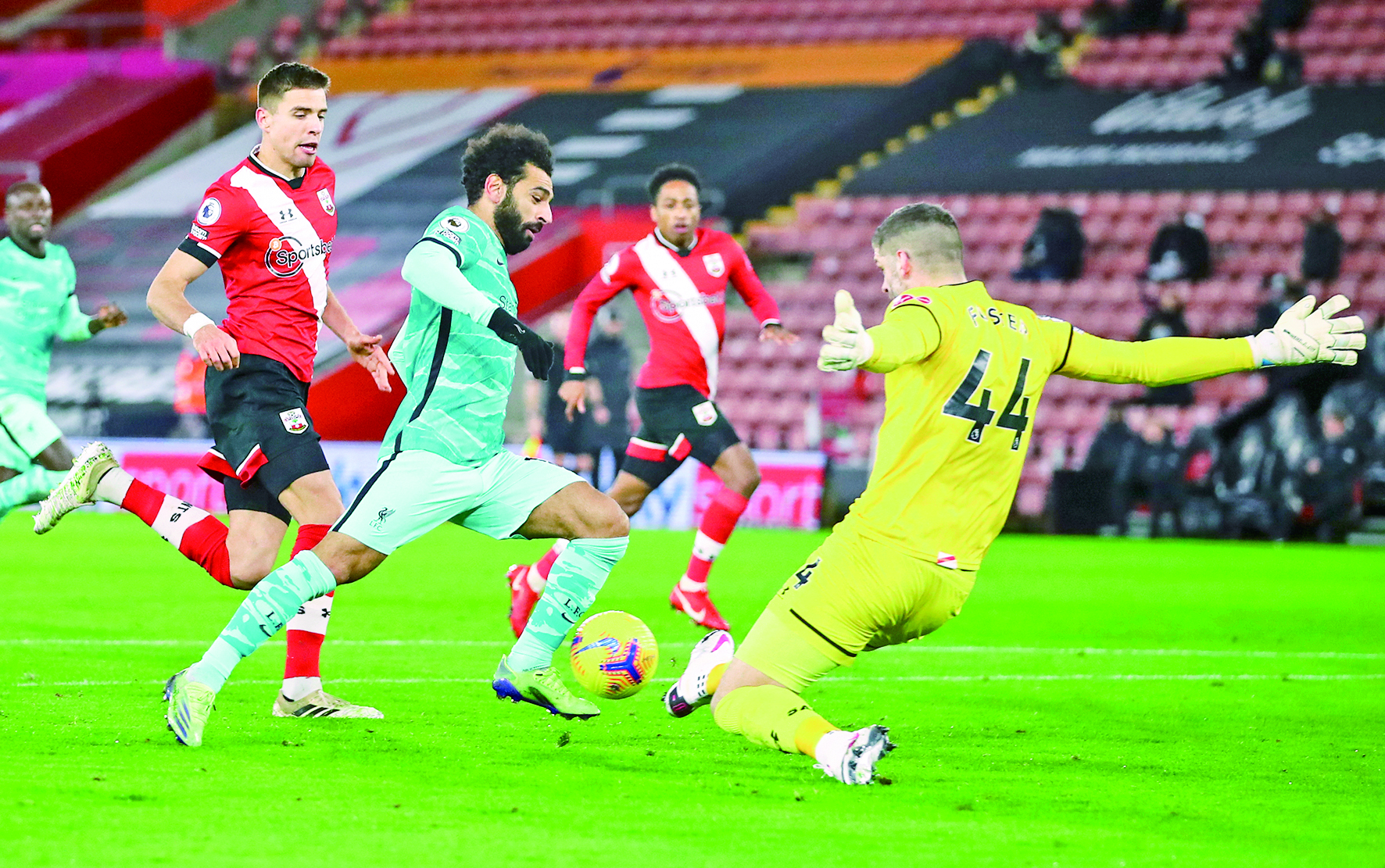 1月4日,南安普顿队守门员福斯特(右一)阻挡利物浦队球员萨拉赫(右三)的进攻。 当日,在2020-2021赛季英格兰足球超级联赛第17轮比赛中,利物浦队客场以0比1负于南安普敦队。