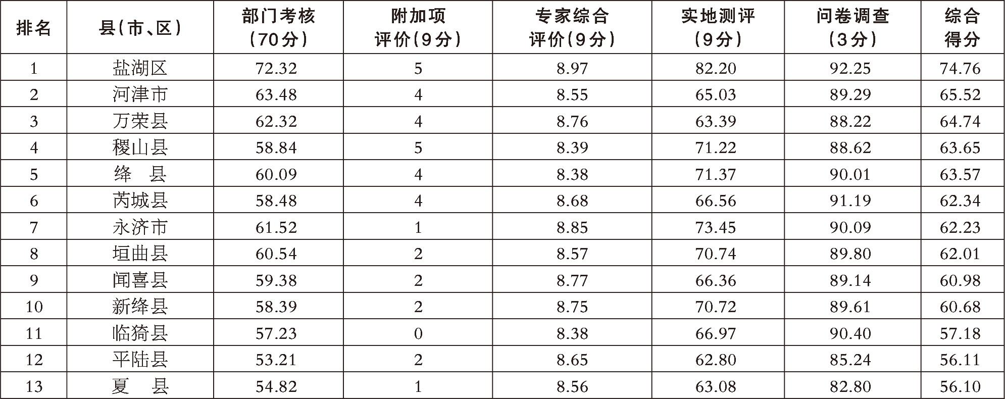 本报讯(记者 孙 雄)近日从市文明办获悉,全市县域精神文明建设评价结果排名揭晓,盐湖区、河津市、万荣县排名靠前,临猗县、平陆县、夏县排名落后。