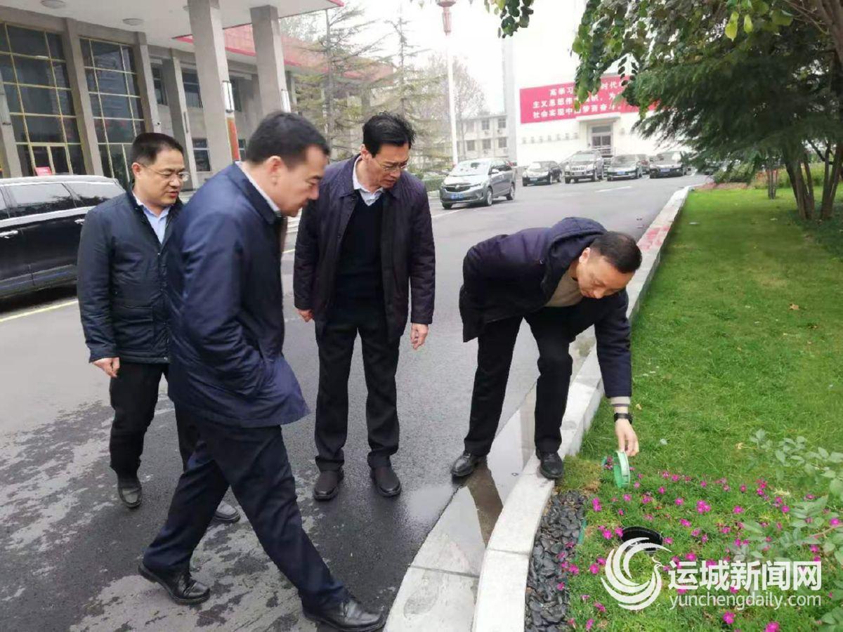 ▲市水务局工作人员在市委、市政府办公楼前查看绿地节水喷灌设施 王露 摄
