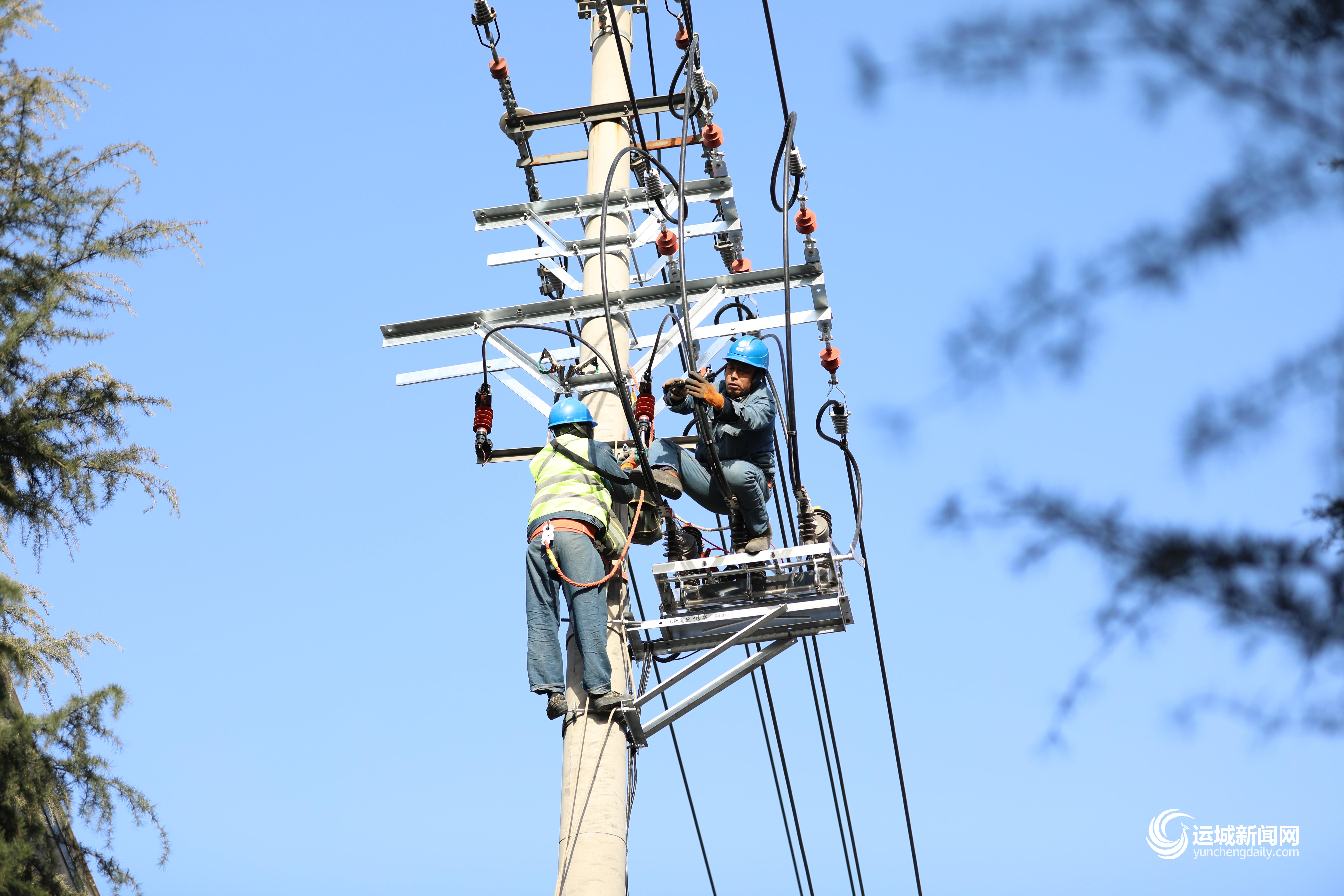 ▲1月6日,国网运城市开发区供电公司工作人员在辖区架设电网专线。