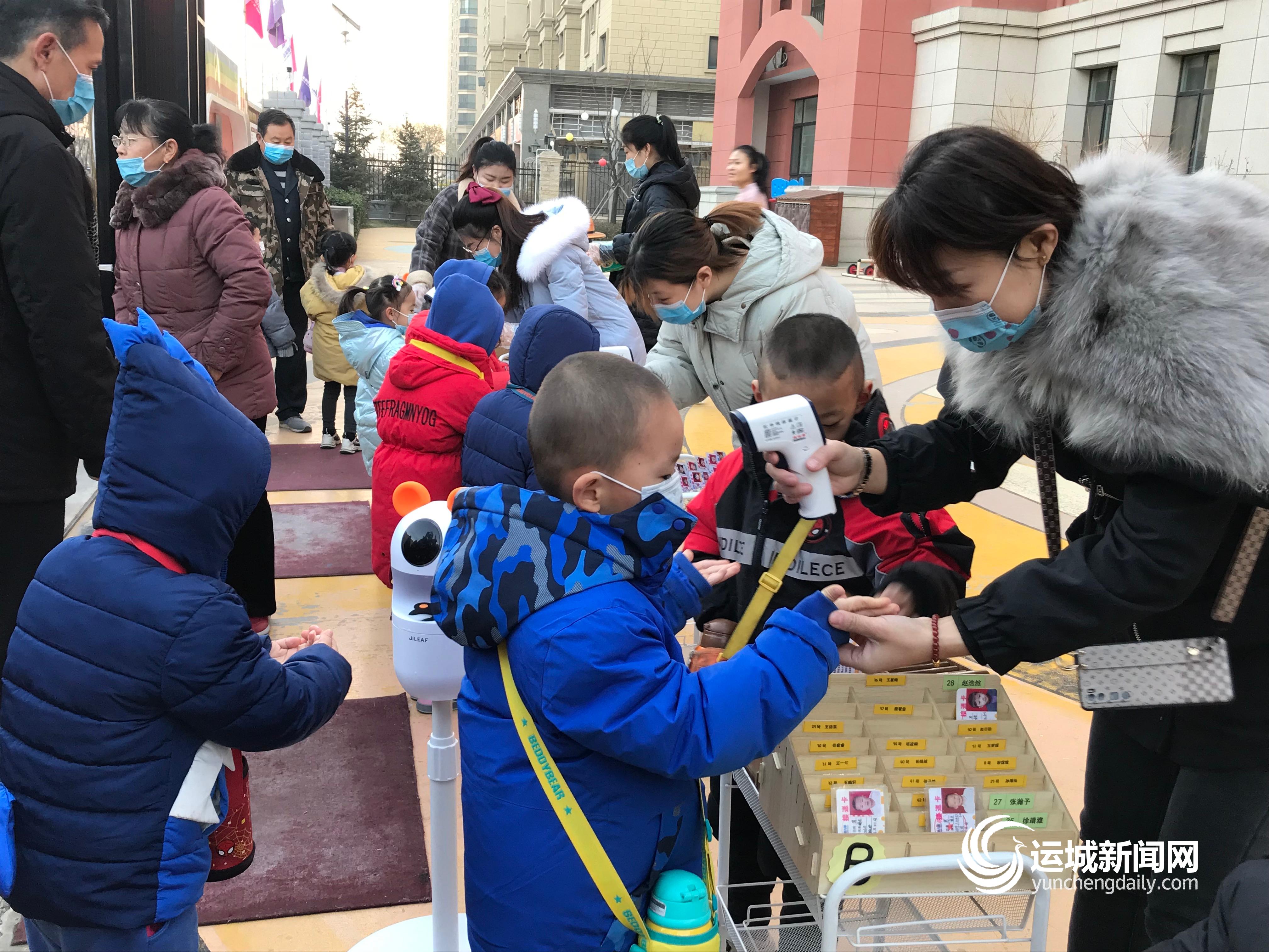 戴上口罩,把手放进自动感应洗手机中清洁双手,进行体温测量,保持1米距离排队进入园内;医务人员逐一检查儿童口腔和双手;在班级门口,进行体温复测和登记……2020年12月25日早上8时,盐湖区第四实验幼儿园的小班孩子们正有序地入园、入班。