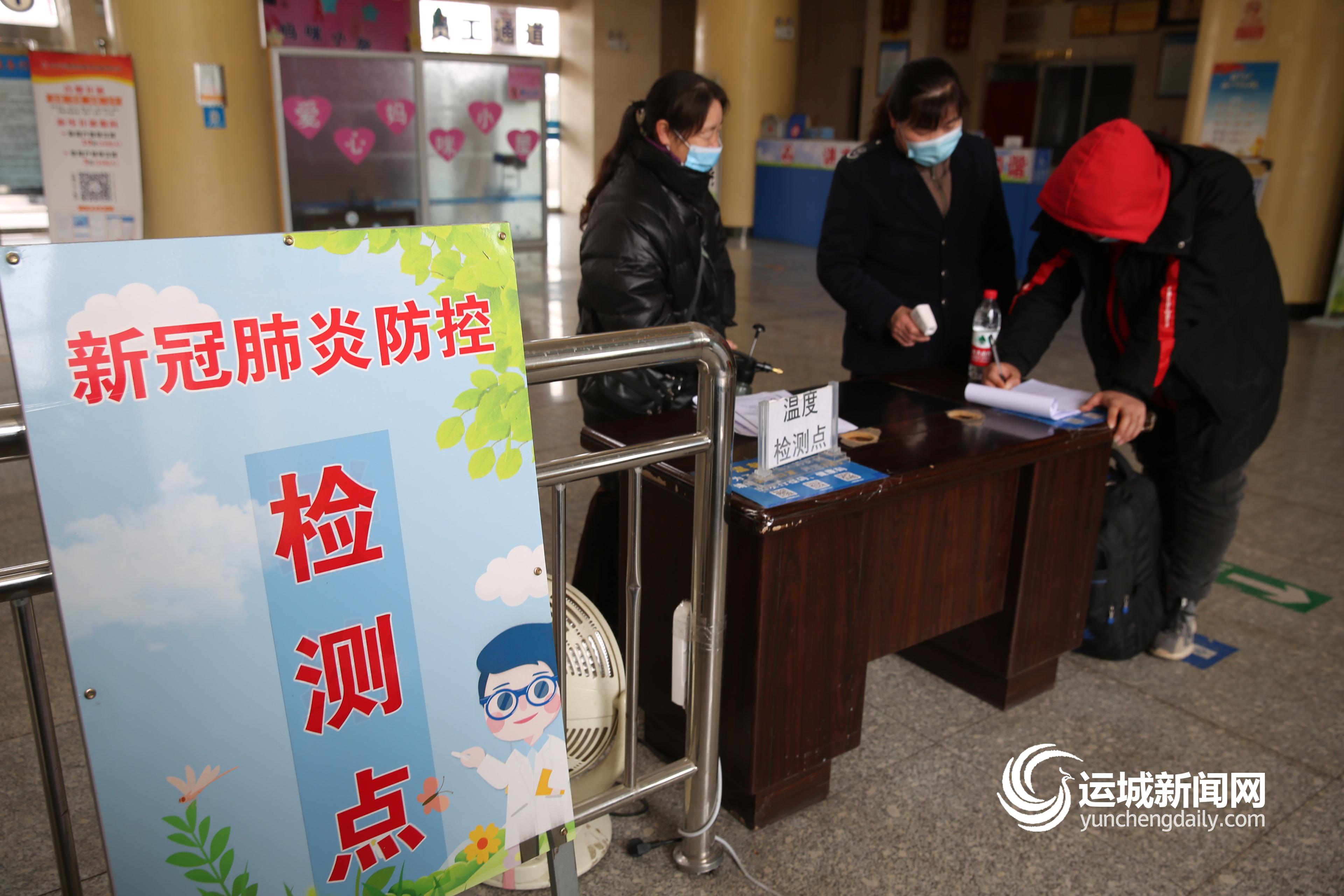 1月9日下午,在永济市舜都汽车客运中心站,工作人员对过往乘客进行逐一排查、检测体温和人员登记。 连日来,该站严格落实疫情防控措施,要求进站乘客和站内工作人员均佩戴口罩,按要求测量体温、登记信息,做到有序进站。出站口也设置了疫情防控检测点,乘客到站后须进行体温检测、身份信息登记、出示健康码及行程轨迹信息后方可出站。与此同时,该站每天对候车室、座椅、垃圾桶等重点区域和重点设施进行全面消杀,通过安全手册、宣传展板、横幅标语、循环广播等形式,加大疫情防控宣传力度。特约摄影 薛启涛