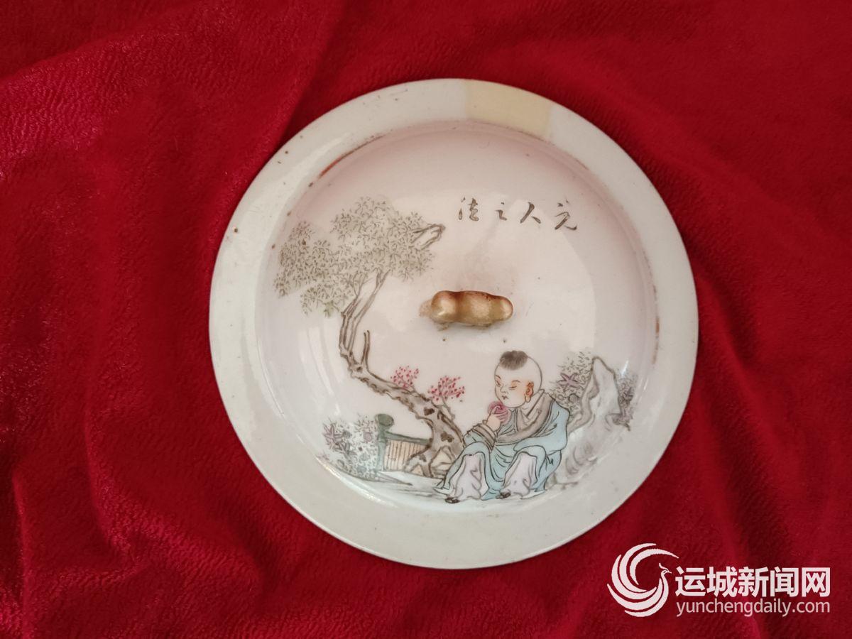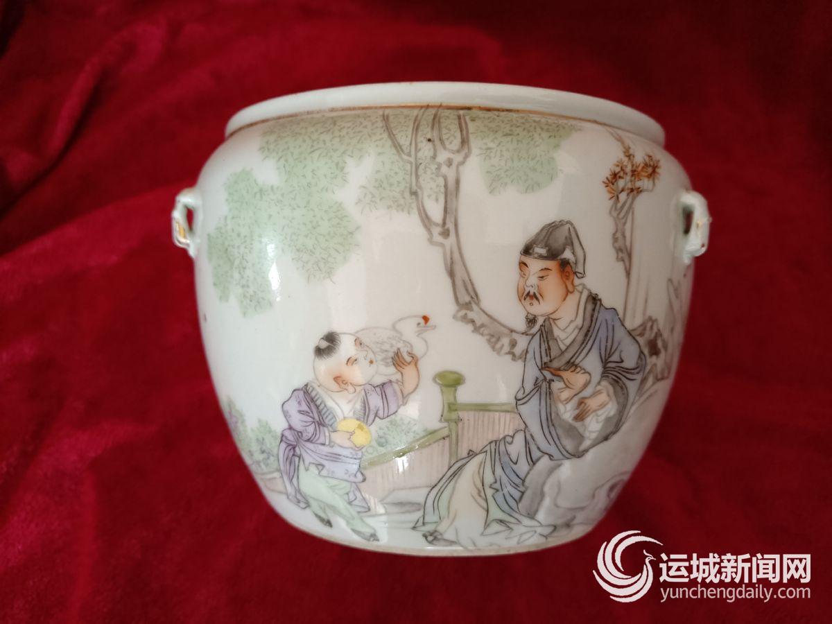 蒲先生把粥罐小心拿出,记者仔细观察,这个粥罐色彩淡雅,是釉上彩,画片内容是“羲之爱鹅”,画面色彩雅致漂亮。粥罐盖上的纽完好无损,还是黄色的釉。