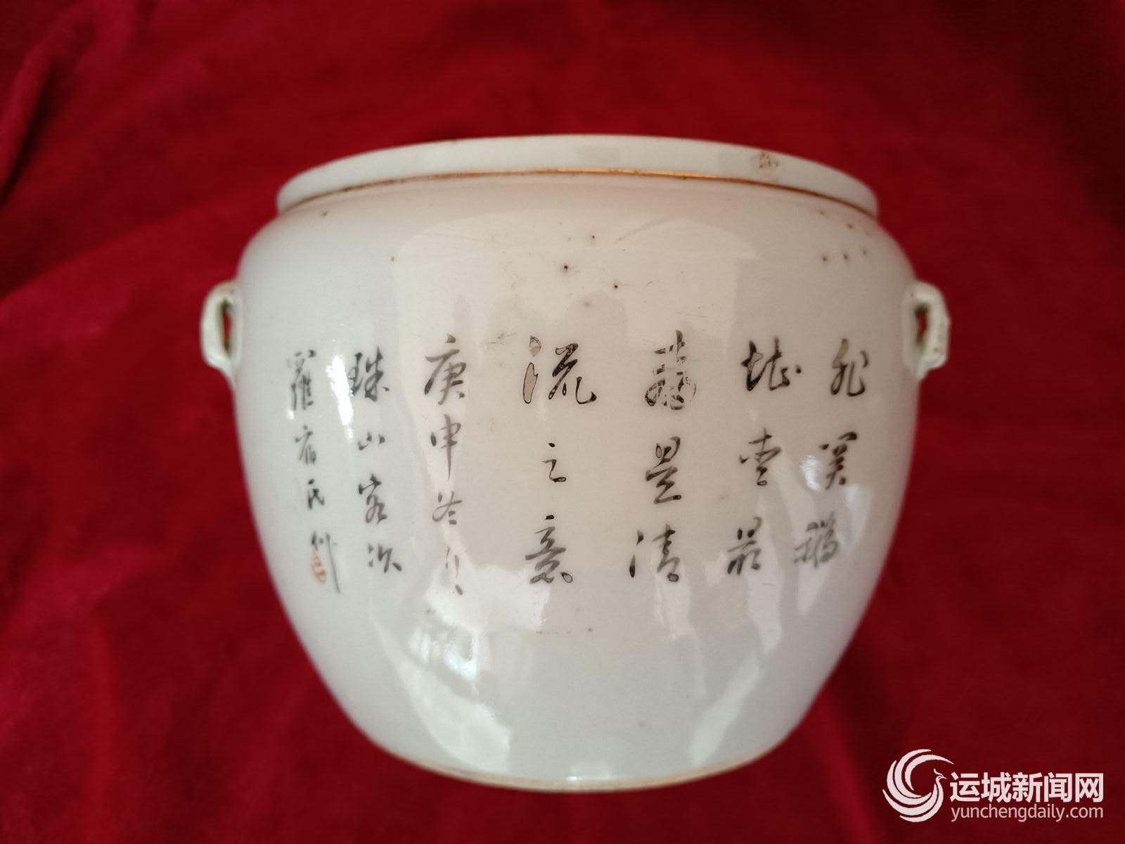蒲先生介绍说,一般粥罐的画片都是以蝙蝠、鹿、灵芝、花草等图案为主,有福禄寿、吉祥如意等美好寓意。像这样以“羲之爱鹅”为主题的人物画粥罐比较少见。这个粥罐上还有一面是书法,落款清晰,还有底款。蒲先生说,他还没有仔细研究,如果是有点名气的作者写的,那就更有价值了。