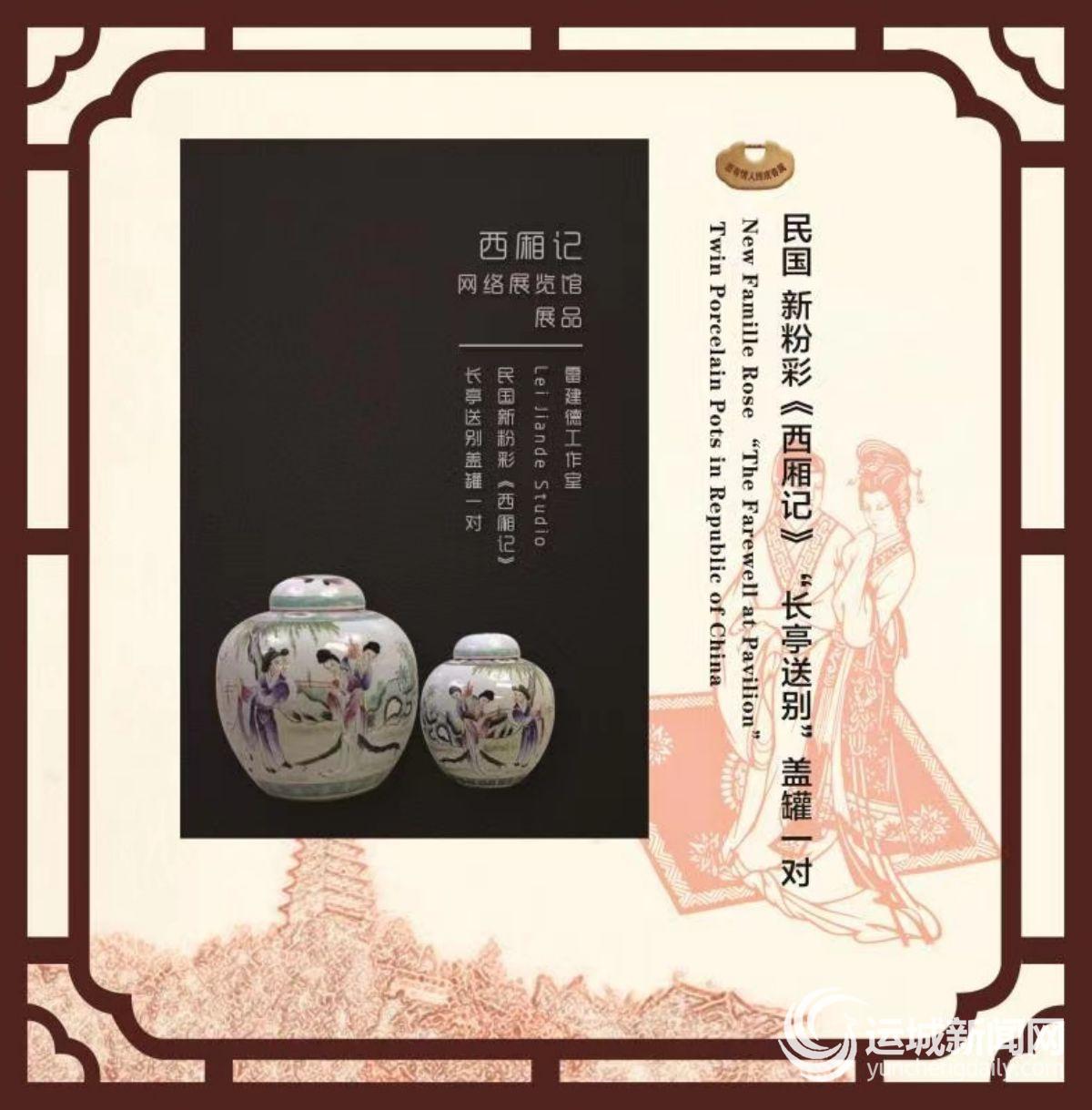 古代展品有元代《西厢记》书法残片图片、明李日华《南西厢记》插图、明钱谷画《西厢记》、明万历环翠堂本《西厢记》“逾墙”插图、徐文琴的明刊本《西厢记》插图研究。此外,还有元青花《西厢记》“焚香”图罐、明崇祯青花《西厢记》“送别”图花觚、明万历六年局部鎏金《西厢记》、《西厢记》清雍正粉彩瓷盘藏品、清康熙青花《西厢记》“送别”图折沿盘、清康熙五彩《西厢记》“长亭送别”图碗等。