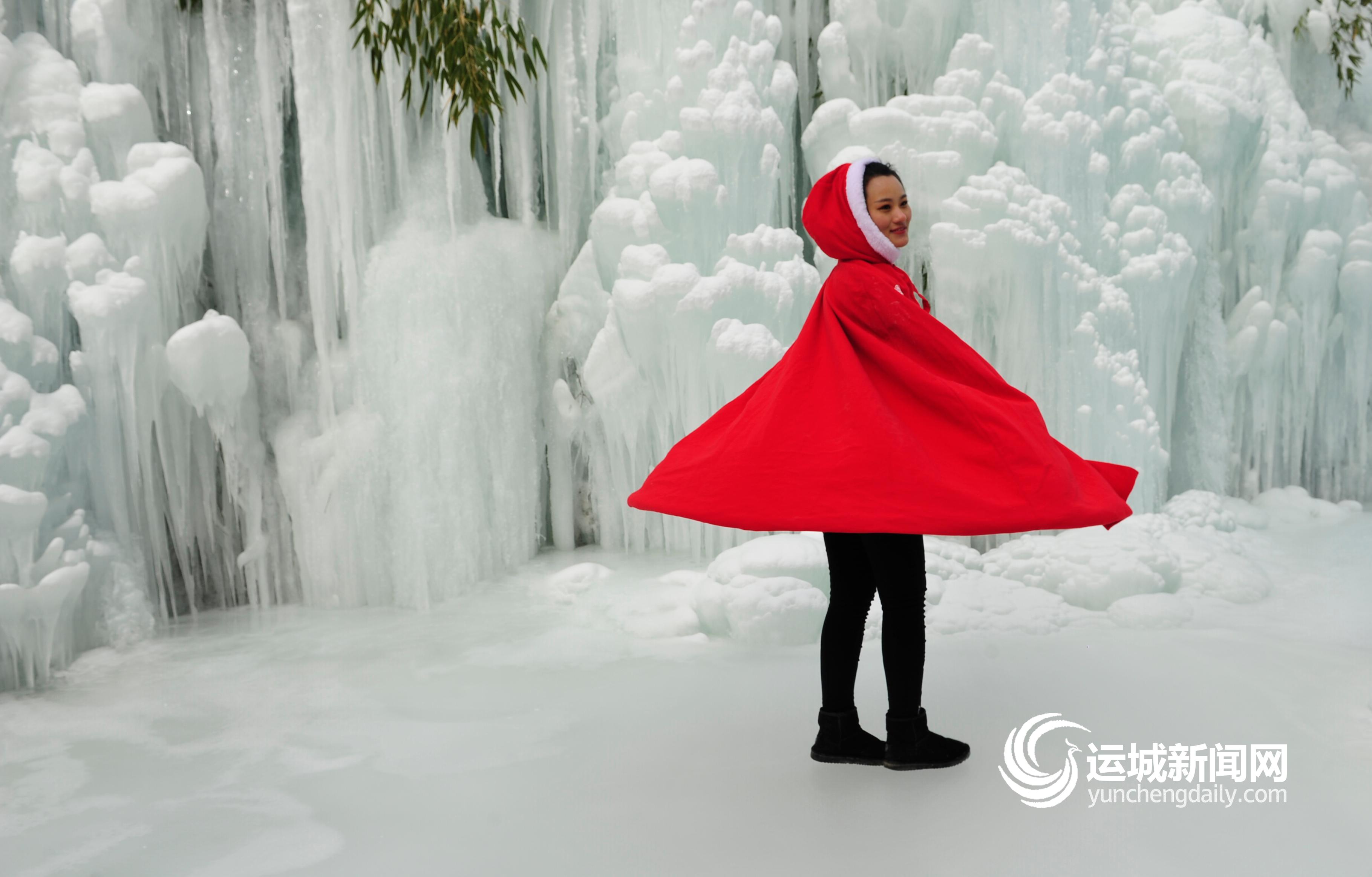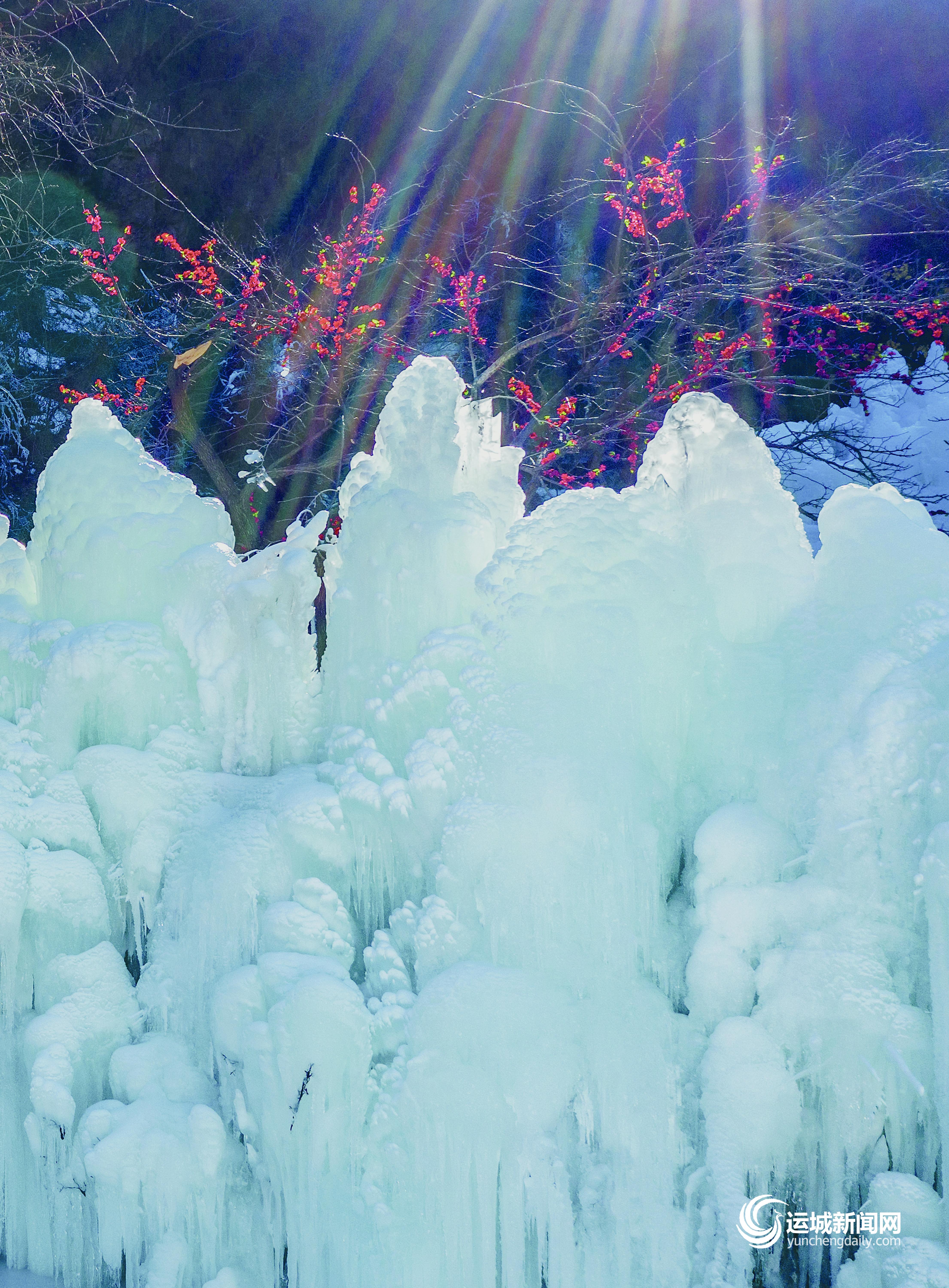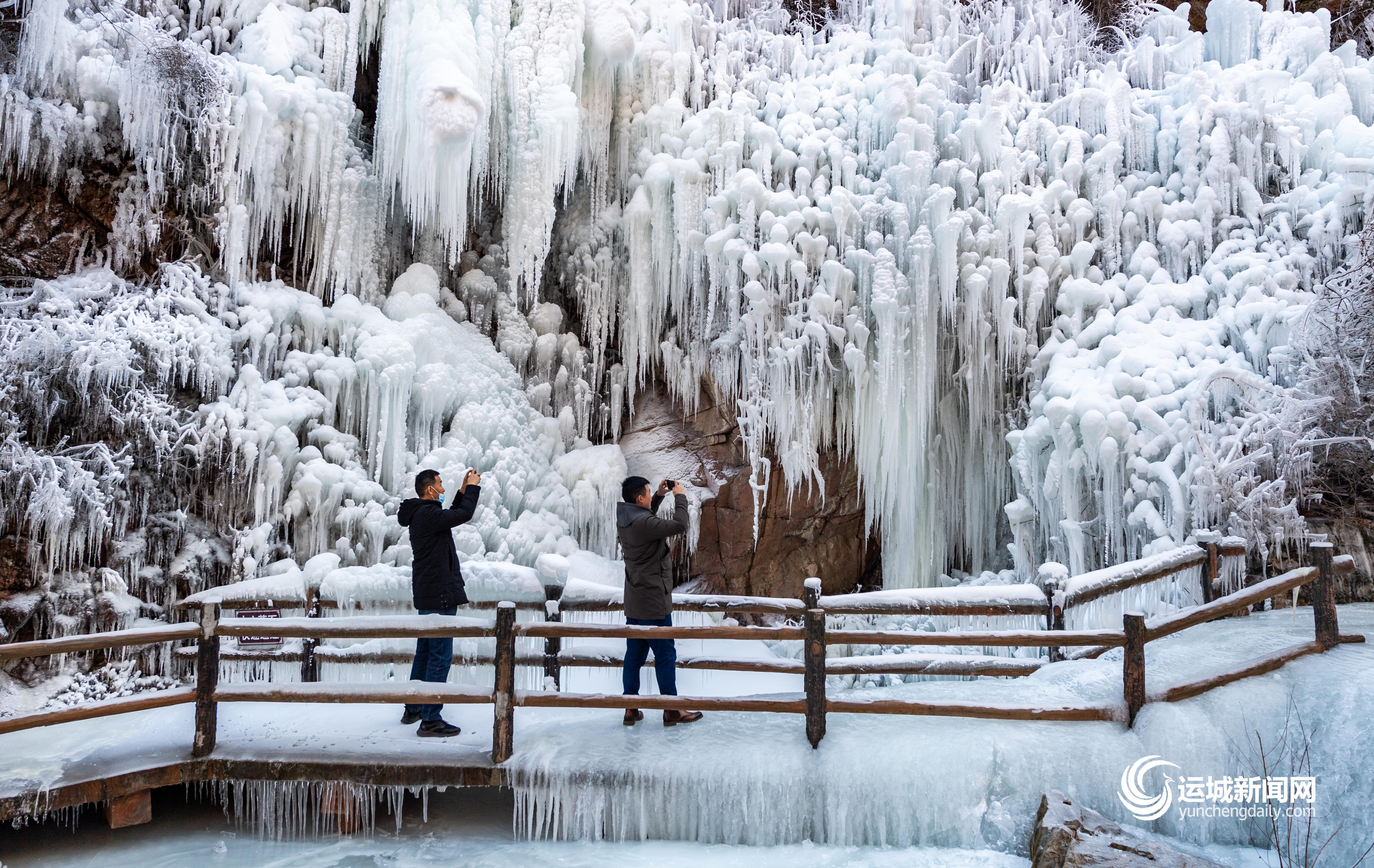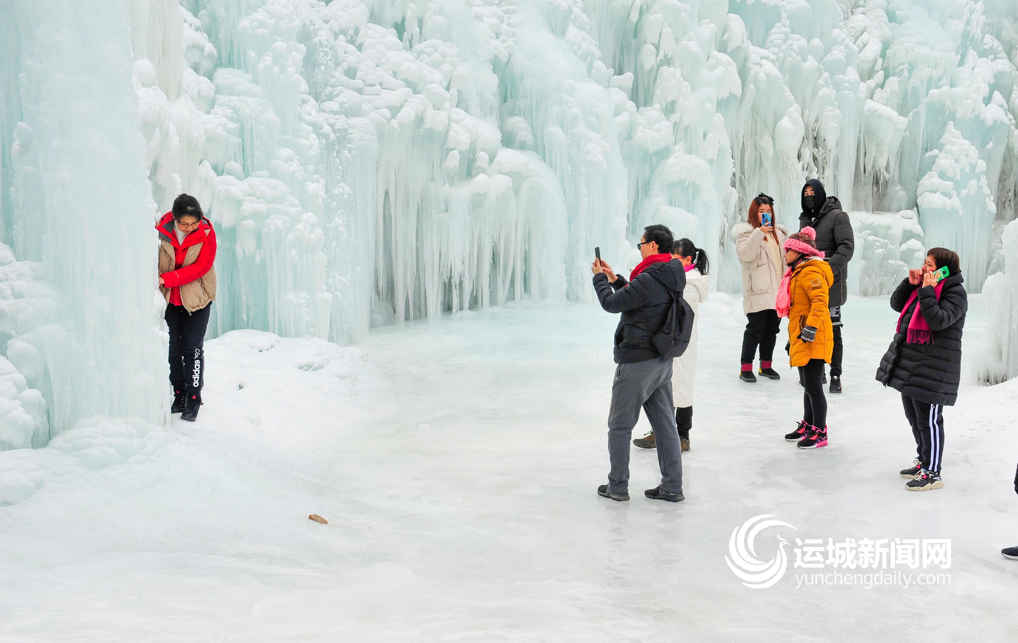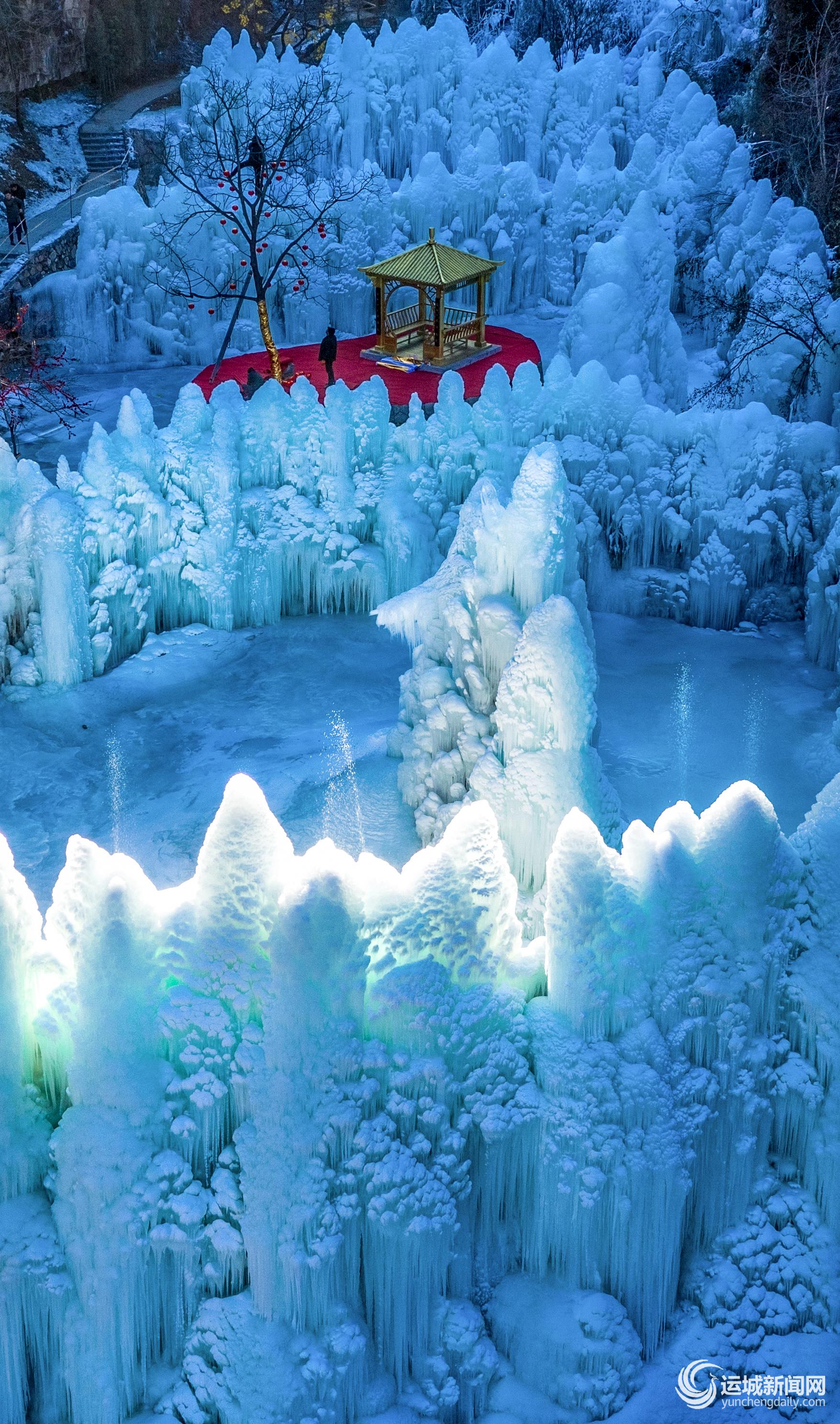 冰挂、冰瀑晶莹剔透,置身其中如梦似幻。1月9日,永济五老峰冰川大世界开园,为游客呈上冰雪视觉盛宴。