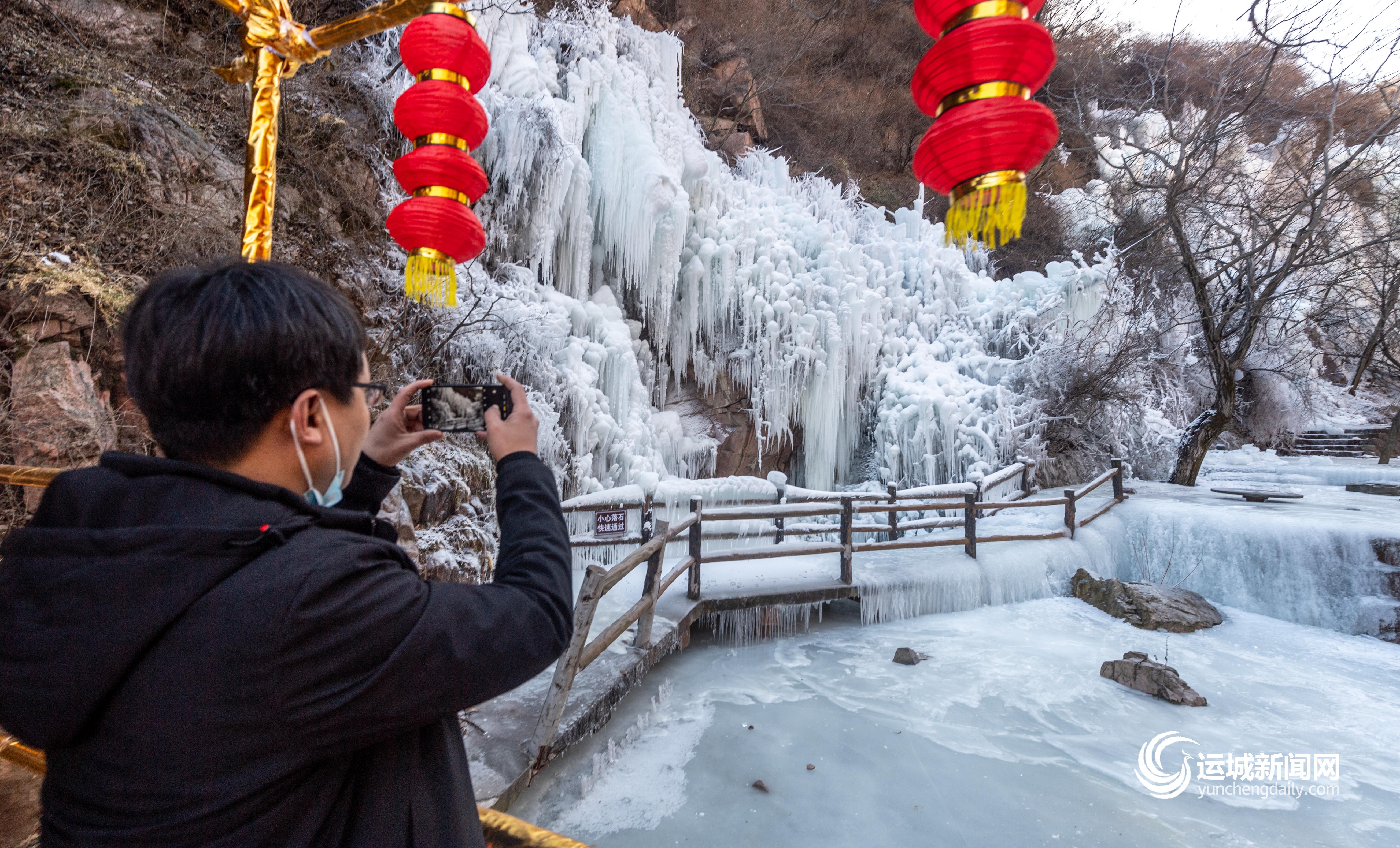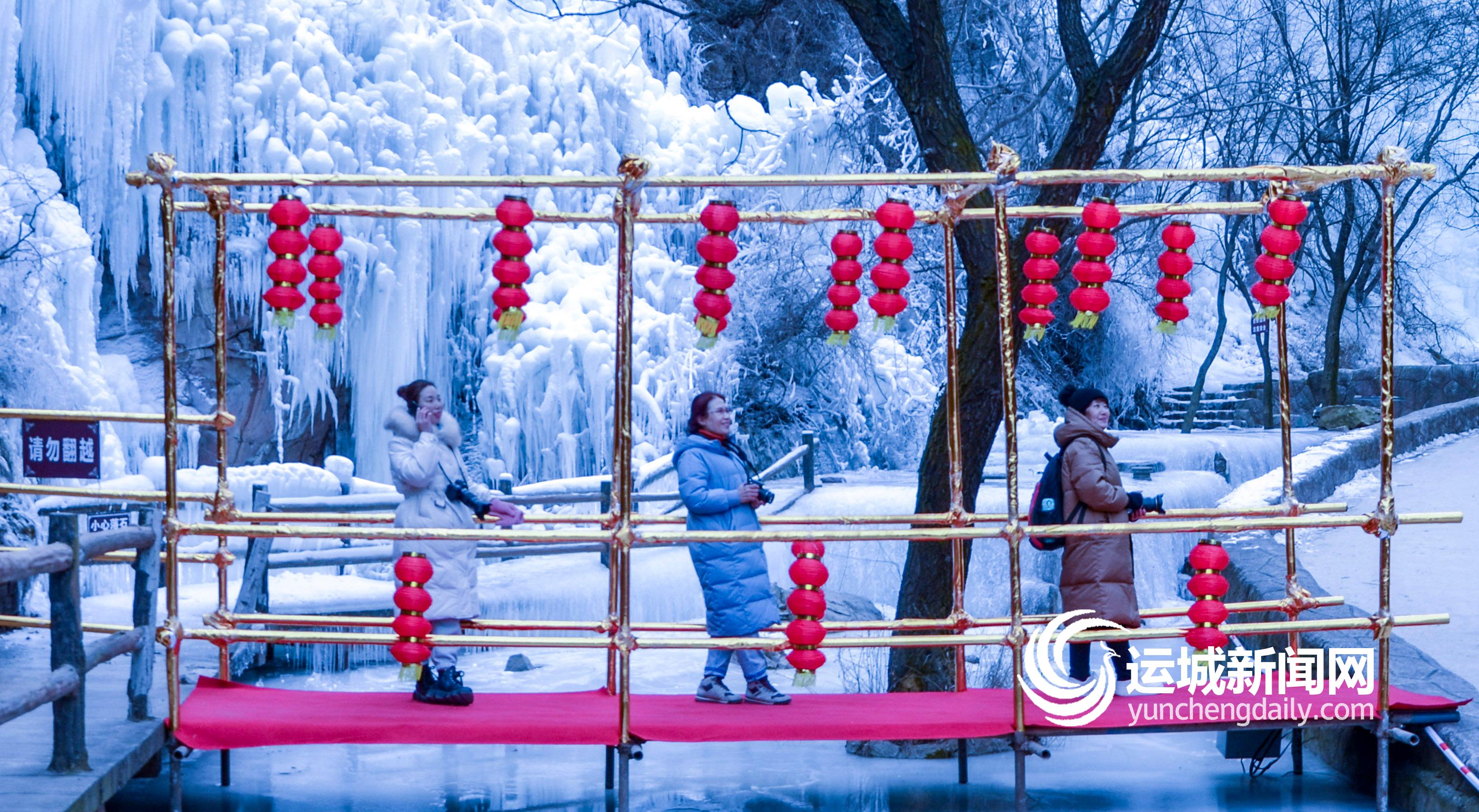 为拉动冬季旅游消费,给广大游客提供春节游的好去处,永济五老峰景区充分挖掘自身资源优势,利用锦绣谷中天然形成的冰挂、冰瀑,组织专业人员进行了40天的雕琢、打磨,创造了一个蔚为壮观的冰雪世界。徜徉其中,处处都是玉树琼花;放眼远眺,满目皆是银峰玉柱。偶有一丛红花绿树从纯白底色中探出头来,配上冰瀑下隐约可闻的潺潺流水声,又平添盎然生机,令人感叹自然之美、生命之美。随处可见的大红灯笼,在白茫茫的冰雪世界中十分惹眼,年味儿浓浓。