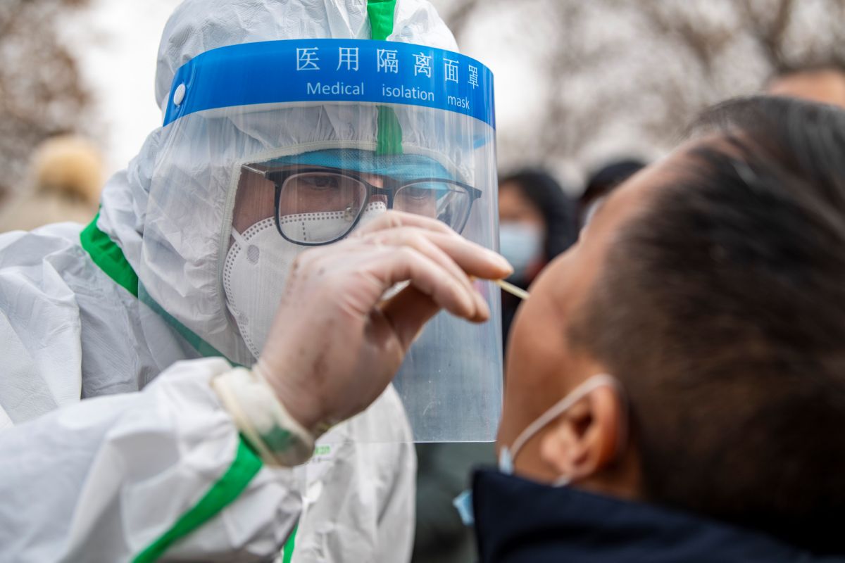 ▲1月13日,医务人员在榆次区锦纶街道核酸采集点为居民进行核酸采样。