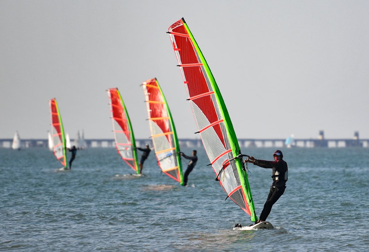 时值冬日,来自上海、浙江、辽宁等全国各地的10余支帆船帆板队在海南省海口市进行冬训,成为这座城市一处独特的风景。 新华社记者 郭程 摄