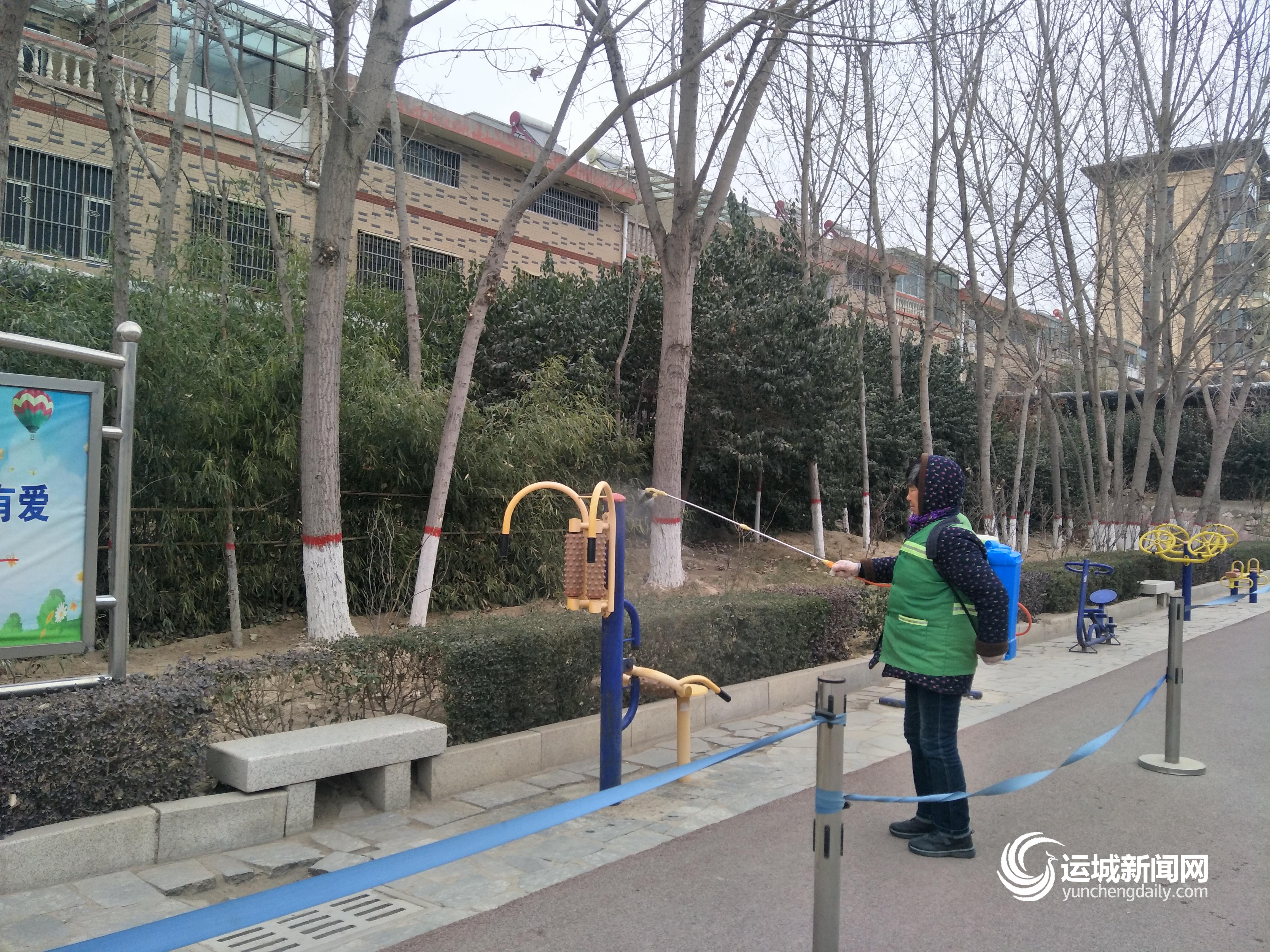 工作人员对健身器材进行消杀