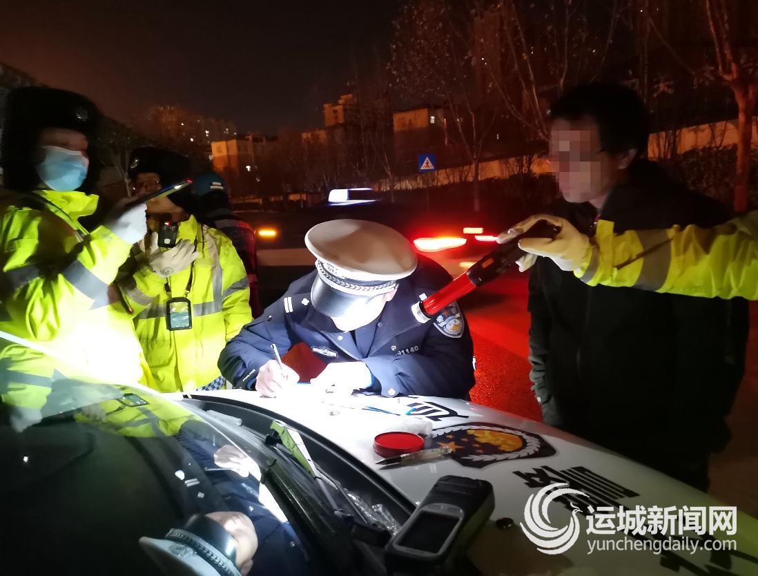 1月8日晚,盐湖交警大队安邑中队、七中队民警在市区条山街星河城等路段对疑似酒驾的驾驶人进行酒精呼气检测。