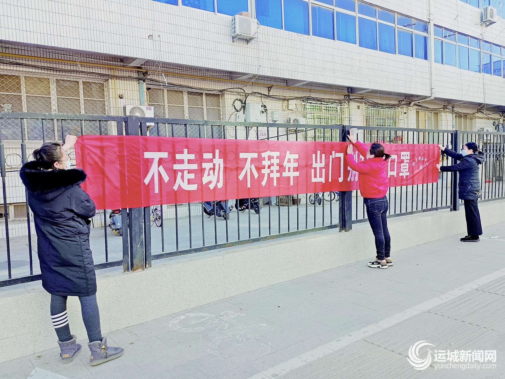 1月13日,芮城县魏园社区工作人员在悬挂疫情防控宣传横幅。